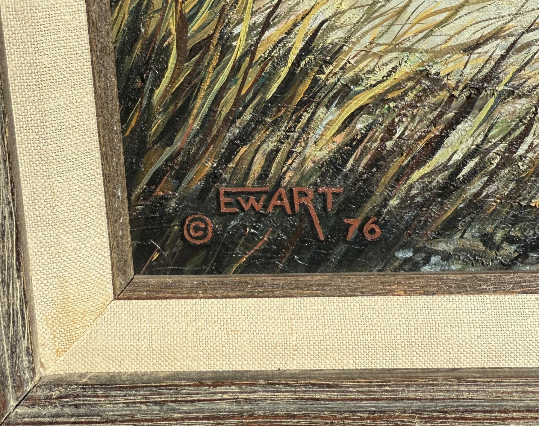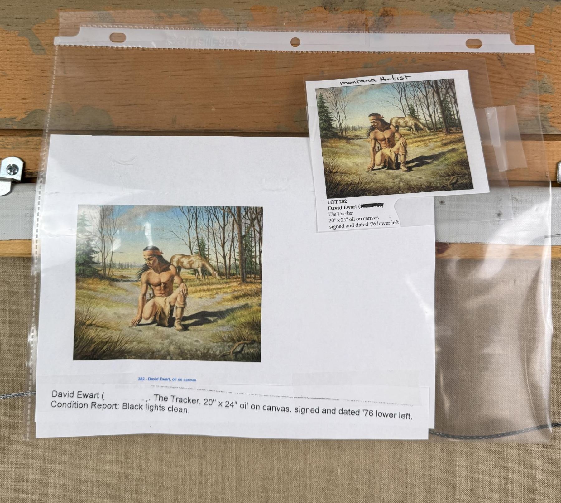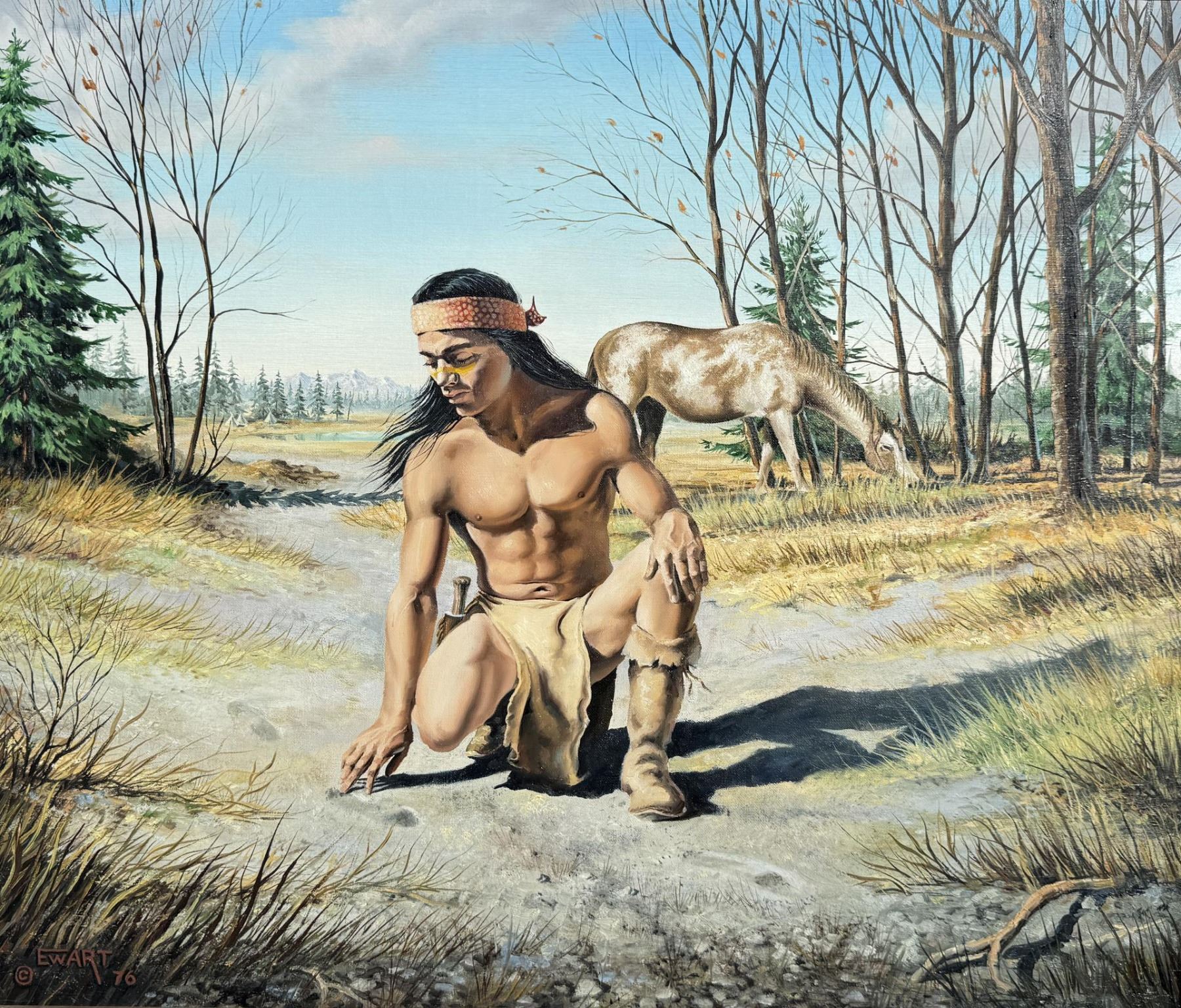 Title is The Tracker. 20" by 24" unframed. 28 1/2" by 32 1/2" framed. Oil on Canvas. David Ewart (20th century) was active/lived in Montana. David Ewart is known for Painting.