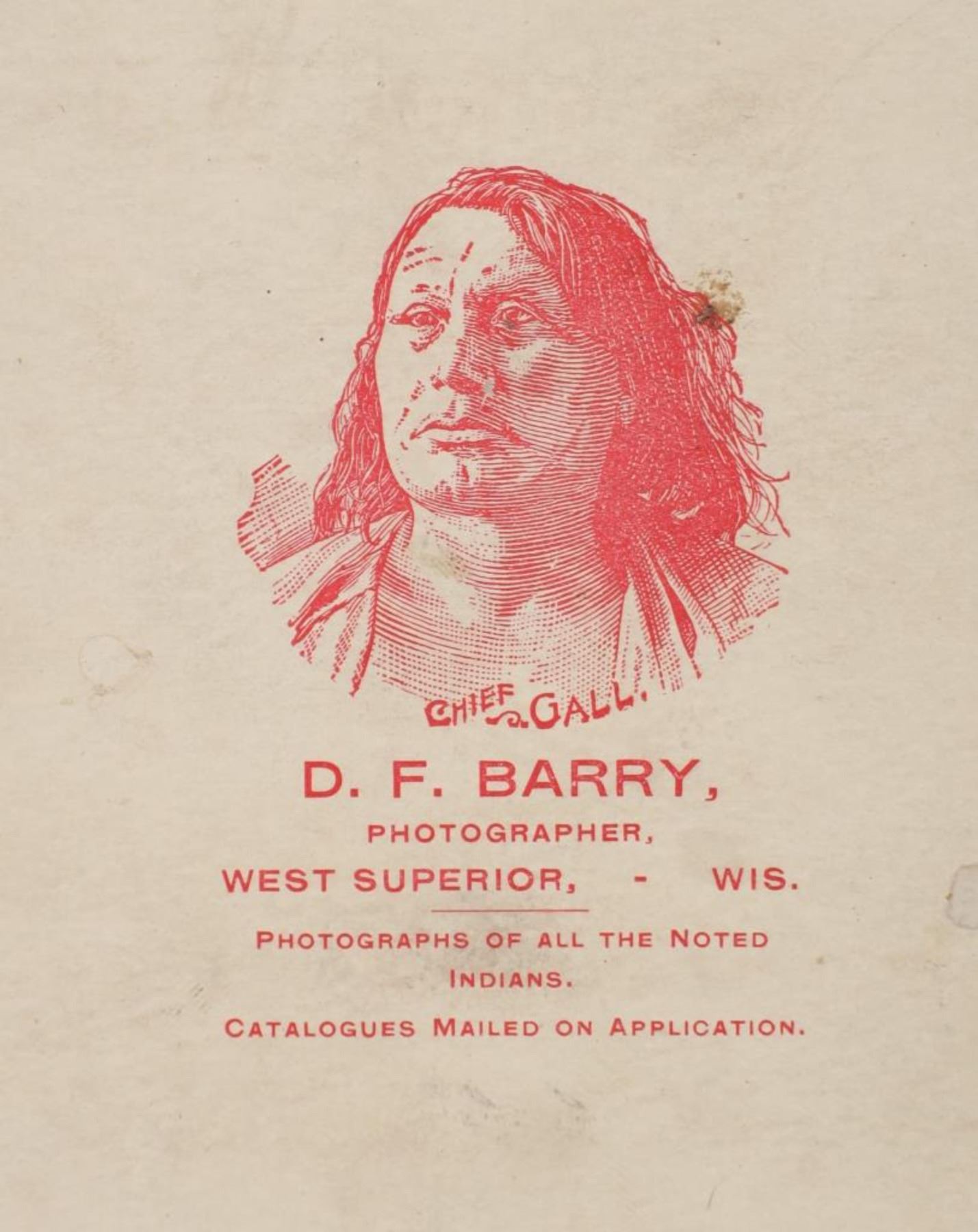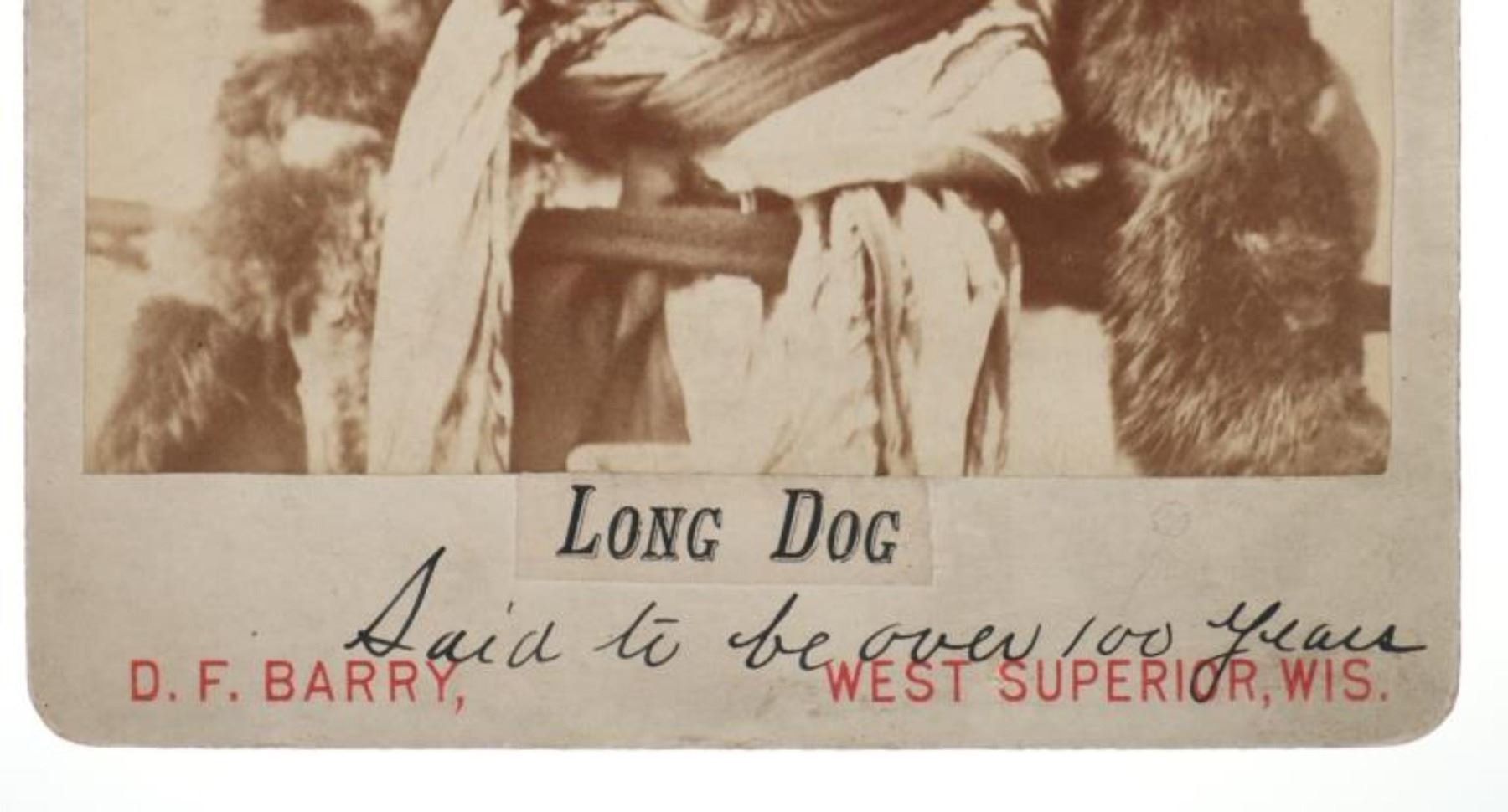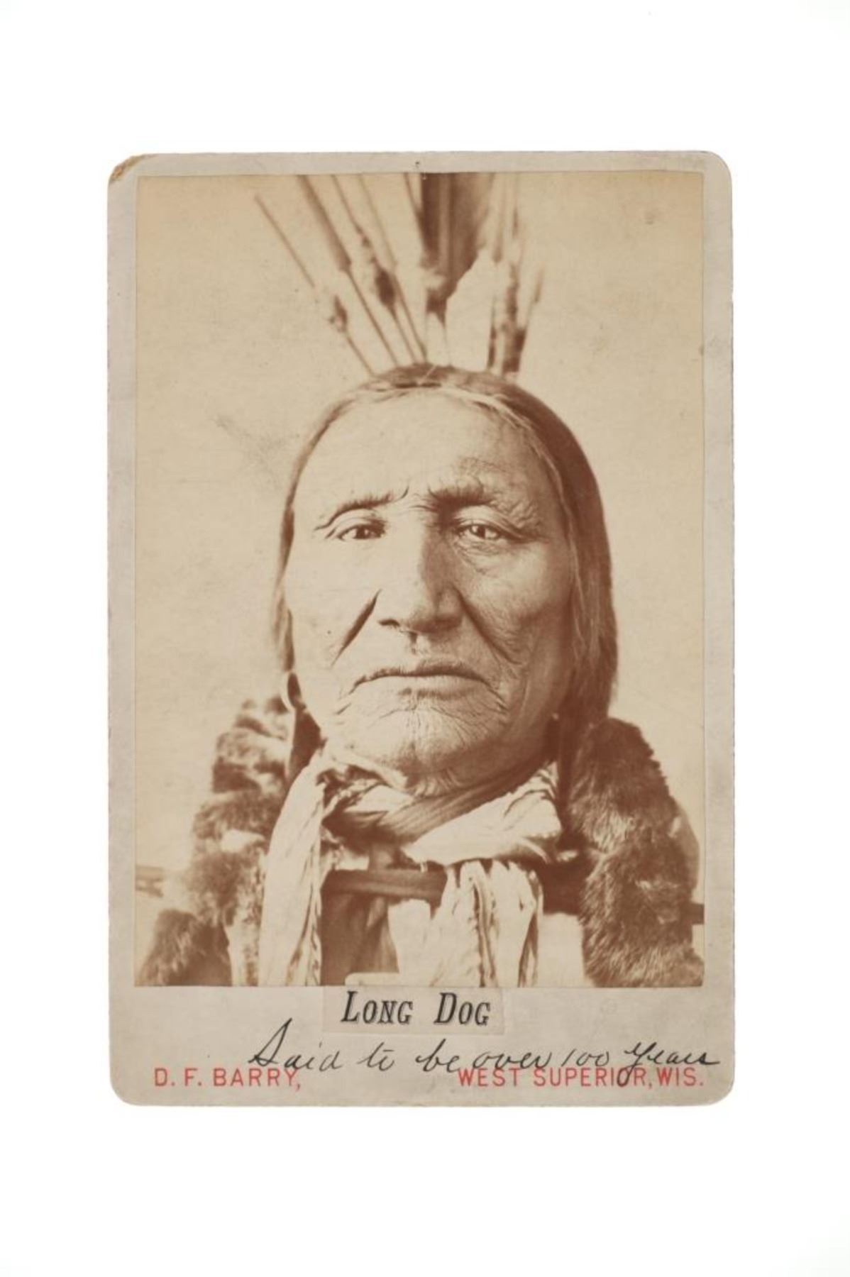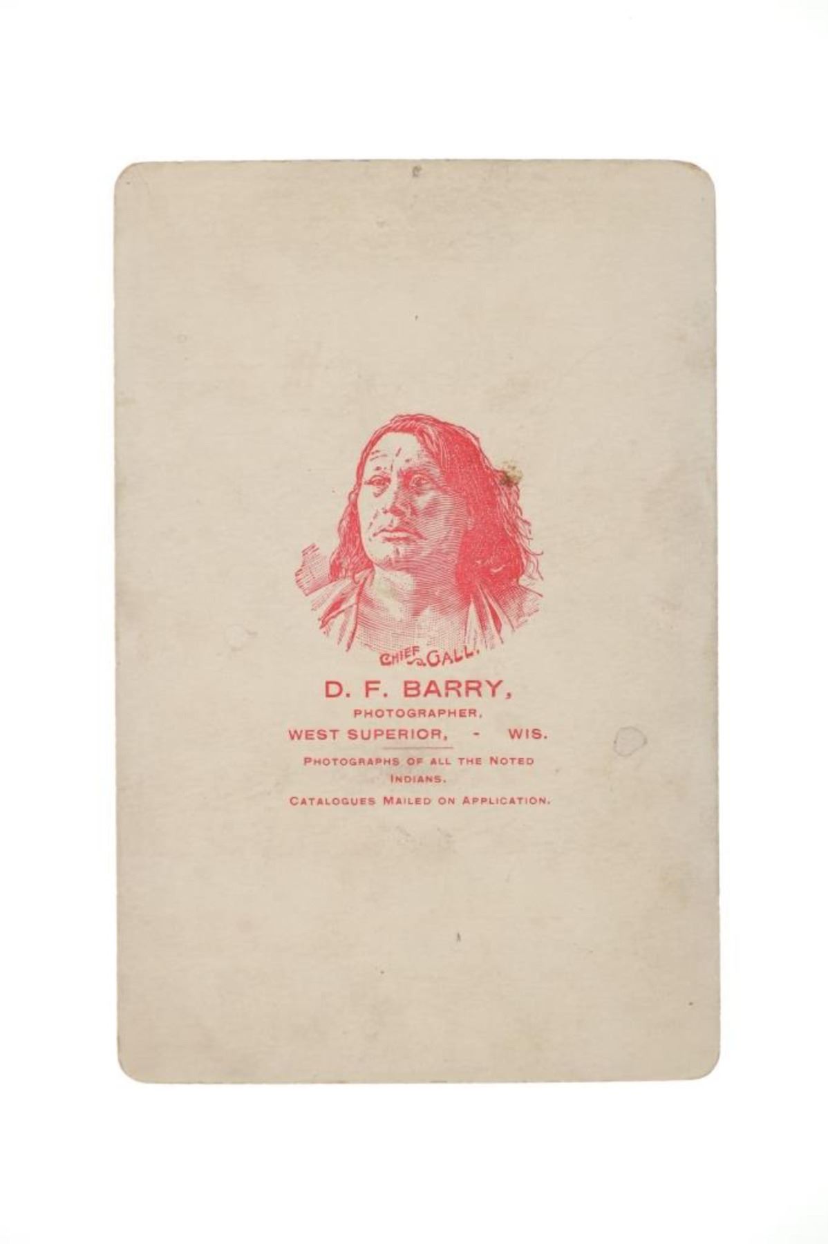 Featured in this lot is this "Long Dog" cabinet card by American photographer David F. Barry born in 1854 and died in 1934; from the ex-collection of the C.M. Russell Museum and John Kleinschmidt. The cabinet card features a wonderfully and professionally crafted original construction that shows a portrait of Long Dog. Long Dog was a Hunkpapa who went to live in the Wood Mountain area of Saskatchewan after LBH & later surrendered to US military authorities with Crow King's band at Ft. Buford. The photos of him at the Glenbow archives show an older looking man. There are a couple of photographs at Glenbow which show Long Dog holding a three-bladed war club, which is now on display at the RCMP Museum in Regina. Stanley Vestal spoke of a man named Long Dog who fought at the battle of Kildeer Mountain, and C. Frank Turner mentions him in his book "Across the Medicine Line". In the caption for the photo in his book, Turner wrote: "Long Dog, a scarred and battered veteran of the wars and sun-dance tortures. A legend among the young men because of the infinite durability of his battle-protective charms, and clear-sighted visions, he was also known as a practical joker and comic". He was said to be over 100 years old. The cabinet card is marked on the front as follows: Long Dog - Said to be over 100 years old (hand written) - D.F. Barry - West Superior, Wis. The back is marked with the company stamp of D.F. Barry and reads as follows: Chief Gall - D.F. Barry, - Photographer, West Superior - Wis. - Photographs of all the noted Indians, - Catalogues Mailed on Application. Provenance: From the John Kleinschmidt collection which was on loan to the C.M. Russell Museum from 1987 to 1993 and included in the "The Cowboy West: 100 Years of Photography 1992-1993 exhibit. The condition of this D. F. Barry cabinet card is well preserved with some wear and shows some spots to the back of the cabinet card but otherwise shows a well preserved condition. The measurements of this cabinet card 6 1/2" x 4 1/4". The collective weight of this cabinet card is U4oz.