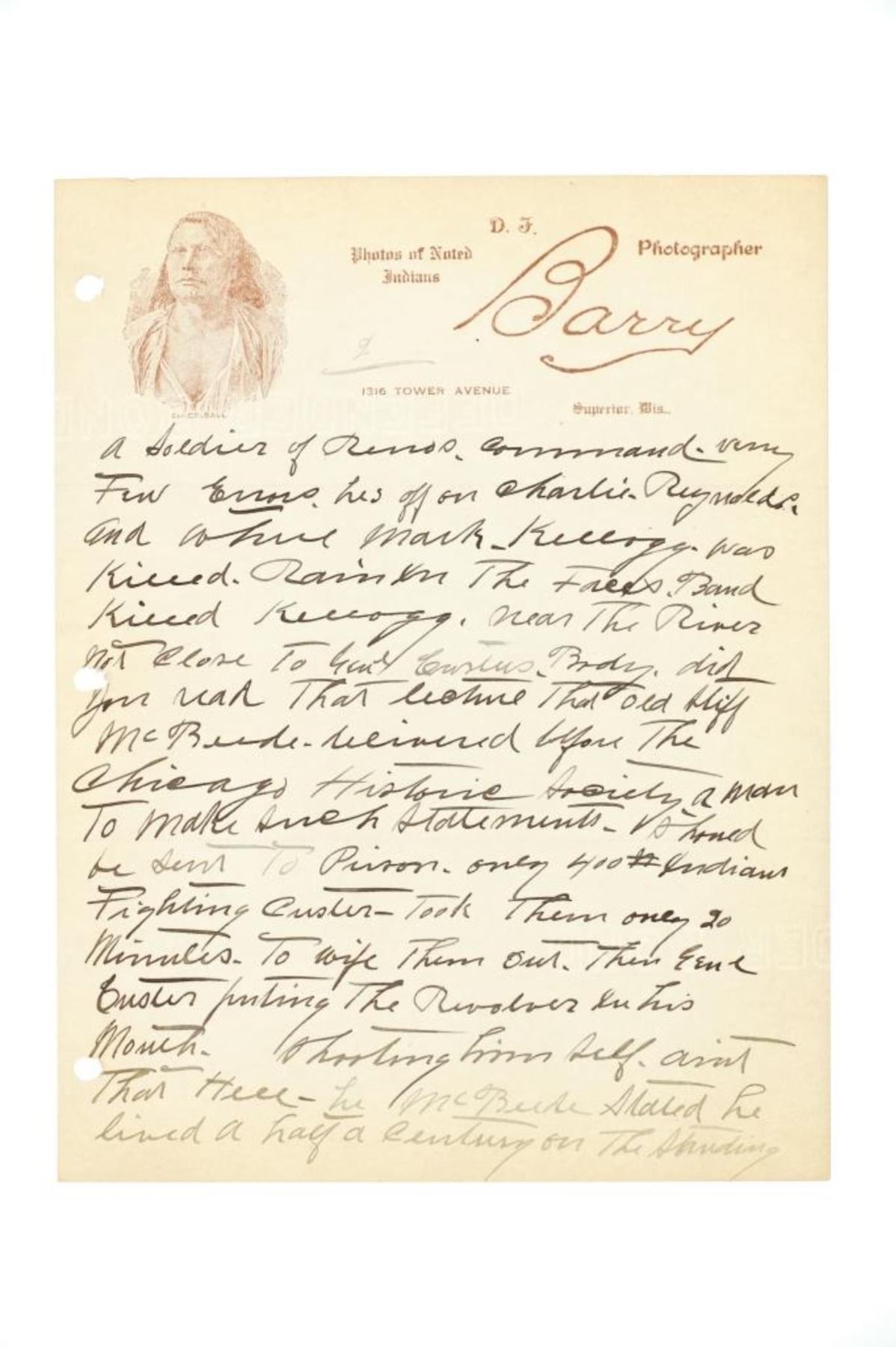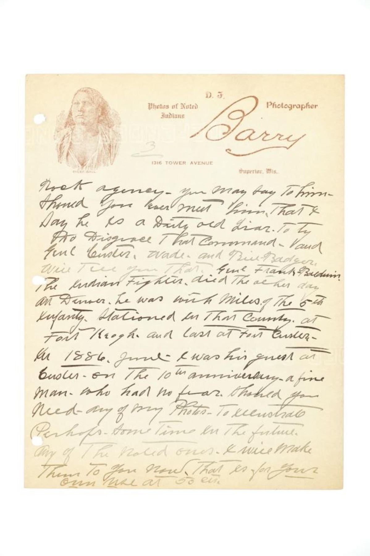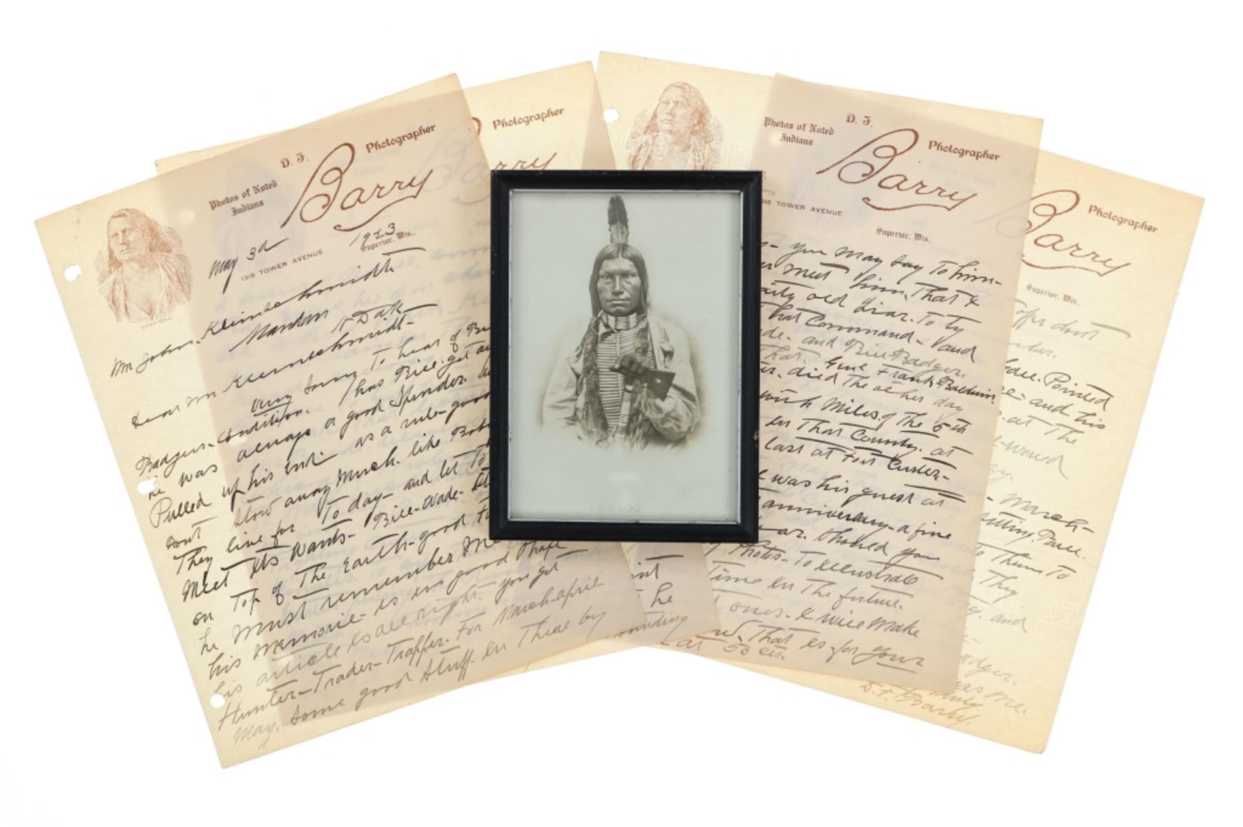 David Francis Barry (1854-1934) was one of the most noted photographers of the American Indian and U.S. Army participants in the Sioux War of 1876 and is attributed with some of the most recognizable surviving images from this period in the history of the American West. Barry first came to the west in the 1870’s to apprentice under photographer O.S. Goff, who worked as the photographer at Fort Abraham Lincoln. It was from this post the Lieutenant Colonel George Armstrong Custer led his Seventh U.S. Cavalry division in May 1876 to the battle of the Little Bighorn in southwestern Montana. This is considered one of the largest collection of Barry photographs from one historic Montana family offered for public sale.