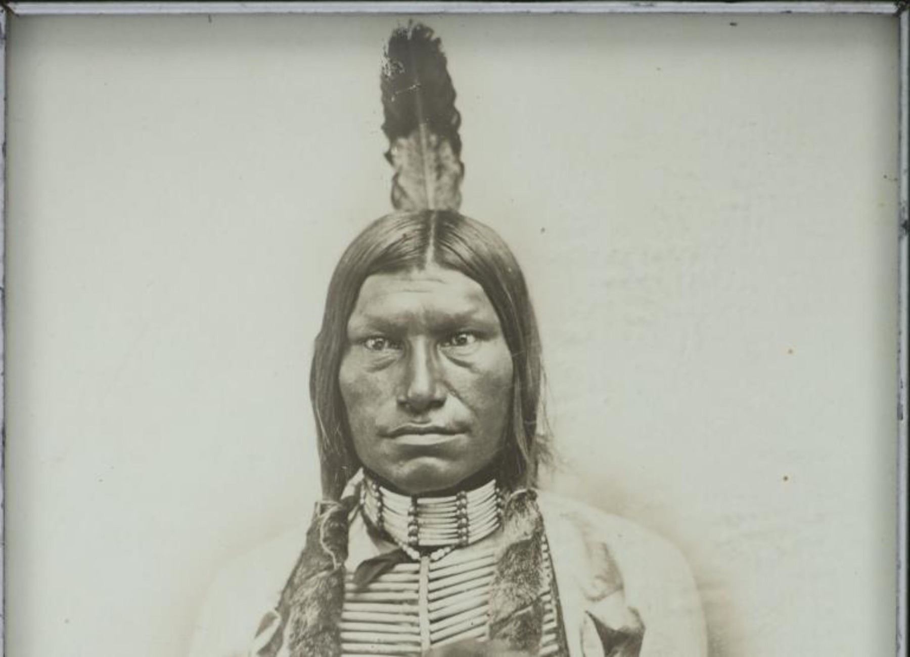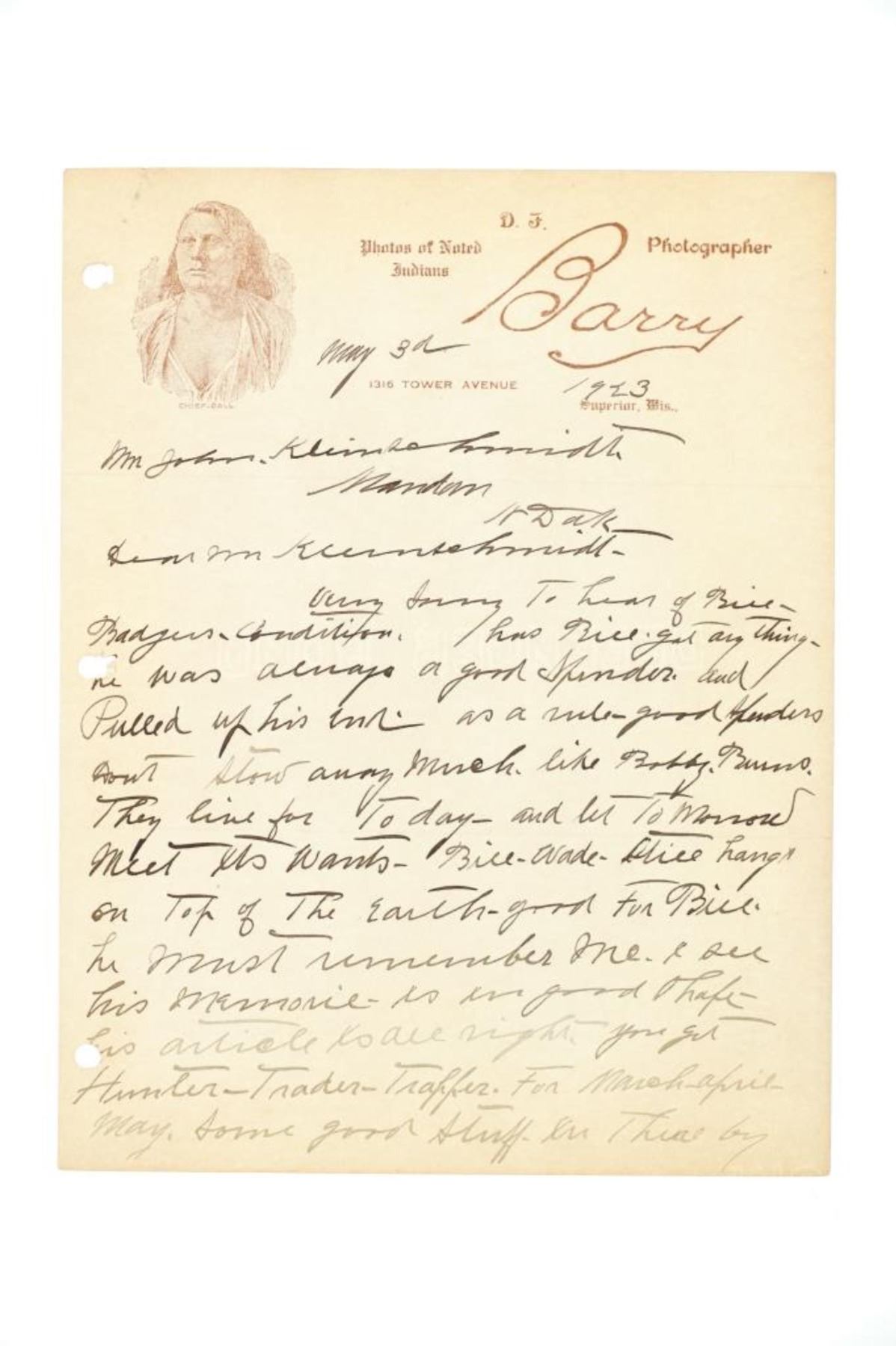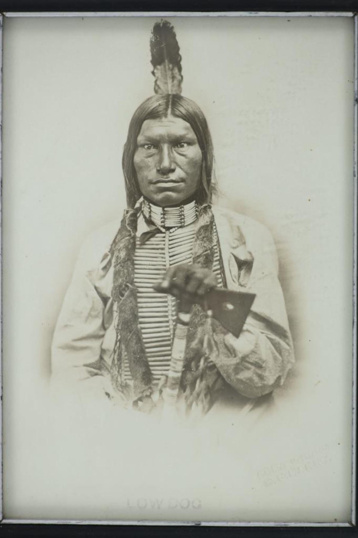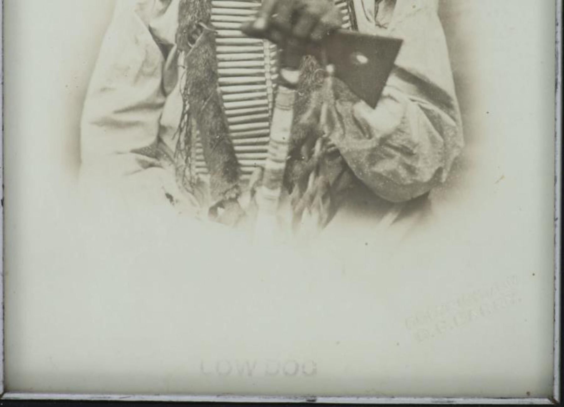 Featured in this lot is this albumen photograph of "Low Dog" from American photographer David F. Barry born in 1854 and died in 1934; from the ex-collection of the C.M. Russell Museum and John Kleinschmidt. The photograph features a wonderfully and professionally crafted albumen photograph that is blind stamped in the bottom right hand corner as follows: Copyrighted by D.F. Barry and Low Dog. The photograph comes with a museum or collectors tag that reads as follows: 1396-87 O'Dell. The photograph shows a portrait of Low Dog holding a tomahawk. The photograph comes complete with a hand written letter from D.F. Barry to John Kleinschmidt that specifically references this photograph as being accused of misrepresenting Low Dog as Bloody Knife along with conveying his disdain for a man named McBride as a liar for claiming to have spent a half century with the Standing Rock Agency. The condition of this of this D.F. Barry albumen photograph is good with no obvious signs of damage to the photograph and some slight wear to the frame but otherwise shows a well preserved condition. The measurements of this framed photograph is 6 7/8" x 5" and the visible photograph measures 6 1/8" x 4 1/4". The collective weight of this framed photograph is 4oz.