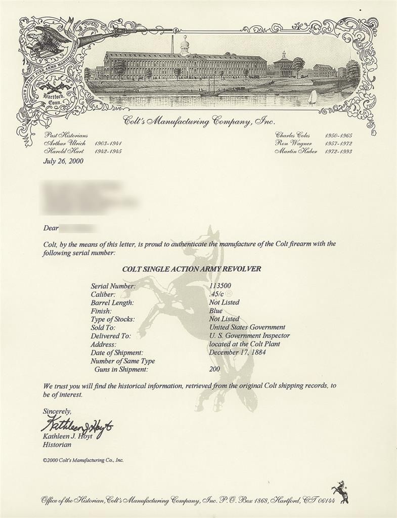 Manufactured in 1884. The factory letter states it is a 45 caliber, barrel length is not listed, it is blue, the type of stocks are not listed, that it was purchased by the United States Government and that it was shipped to the U.S. Government Inspector at the Colt plant on December 17th, 1884.
