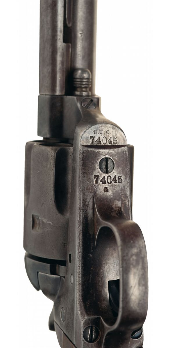 Colt Single Action Cavalry Model revolver manufactured in 1882 and subsequently restored in the 20th Century. The revolver has the early bulls-eye ejector rod head and cavalry style hammer with elongated bordered knurling on the spur. This revolver is stamped with the "D.F.C." mark of Ordnance Sub-Inspector David F. Clark on the underside of the barrel, bottom of the frame, side of the cylinder and lower right side and left heel of the grip. The final inspection mark of Lieutenant Charles C. Morrison ("CCM") is stamped on the lower left side of the grip. The date of inspection, "1882" is stamped above the "CCM" final inspection mark. "P" proofmarks are stamped on the underside of the barrel and the side of the cylinder. The "U.S." property mark is stamped on the left side of the frame. The barrel is roll-stamped with the legend "COLT'S PT. F.A, MFG. Co. HARTFORD CT. U.S.A." in elongated block letters. The left side of the frame is roll-stamped with the Colt three date/three line patent markings. The inside of the loading gate is stamped with the assembly number "1092". The full serial number "74045" is stamped on the bottom of the frame, trigger guard and back strap. The partial serial number "4045" is located on the barrel underneath the ejector housing and on the side of the cylinder. All of the visible serial numbers match. A "Z" Colt sub-inspection mark is stamped in the hammer well and "G" and "L" sub-inspection marks are stamped on the barrel behind the ejector housing stud. Most of the Single Action Cavalry Model revolvers were altered to "Artillery" configuration between 1896 and 1903. Original configuration Colt Single Action Cavalry Model revolvers are scarce.