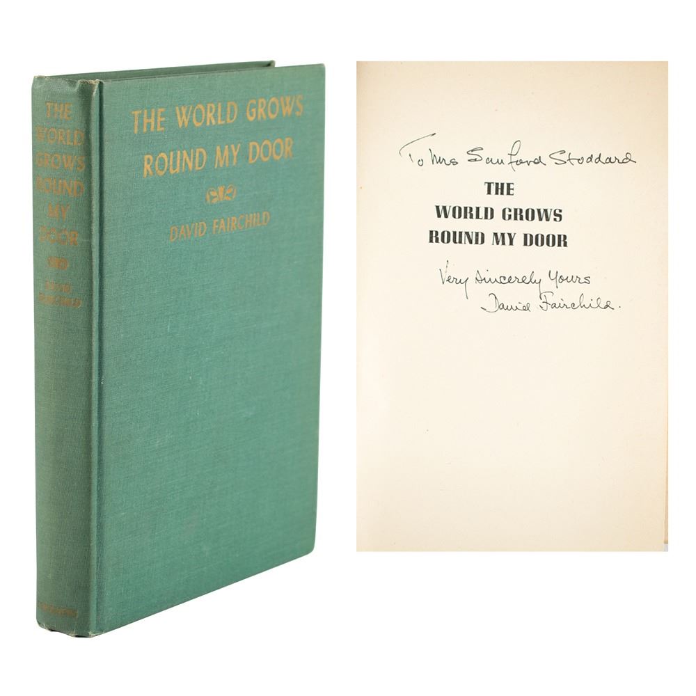 Signed book: The World Grows Round My Door. First edition. NY: Charles Scribner's Sons, 1947. Hardcover, 6.5 x 9.5, 347 pages. Signed and inscribed on the half-title page in ink, "To Mrs. Sanford Stoddard, Very sincerely yours, David Fairchild." In fine condition, with the image that was once part of the front panel of the dust jacket clipped and affixed to the first free end page.
