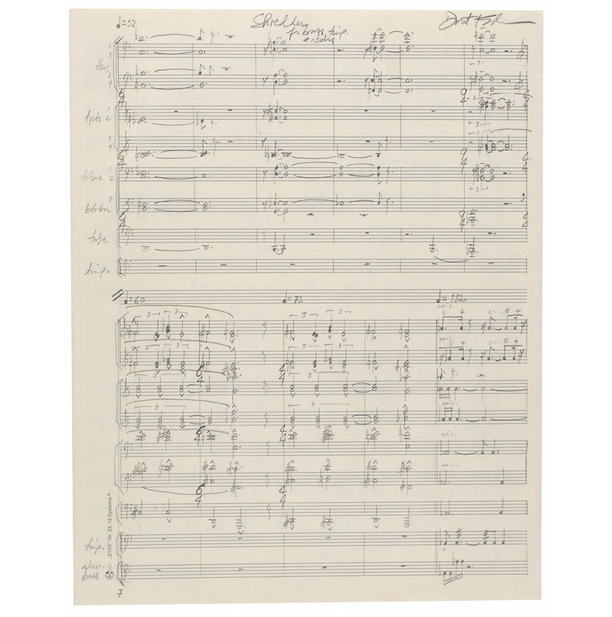 Exceptional autograph musical manuscript in pencil, twelve pages on three sets of adjoining music manuscript paper, 10.5 x 13.25, signed and titled at the top in pencil, “Shredder, David Felder.” A final draft of “Shredder” with some evidence of revision, composed in 2001 for brass ensemble, timpani, and electric bass or synthesizer. The score is of the complete work and thoroughly impressive. In fine condition. This piece was commissioned by the Metalafonico ensemble and first performed in Buffalo, New York, in June 2001.
