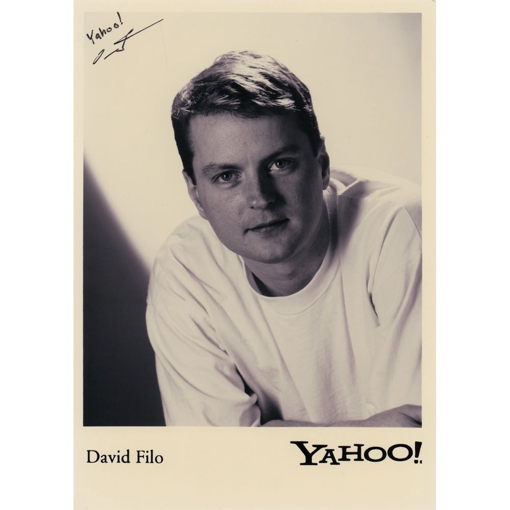 Billionaire businessman (born 1966) who, with Jerry Yang, co-founded the Yahoo! web portal. Glossy 5 x 7 Yahoo! promo photo of the company's co-founder, signed in black felt tip, "Yahoo! David Filo." In fine condition.