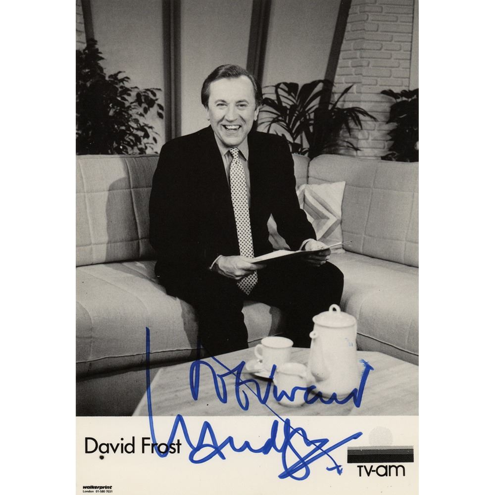 Desirable 4 x 5.75 TV-AM promo card of David Frost on the set of his news program, signed and inscribed in blue felt tip, "To Howard, David Frost." In fine condition.
