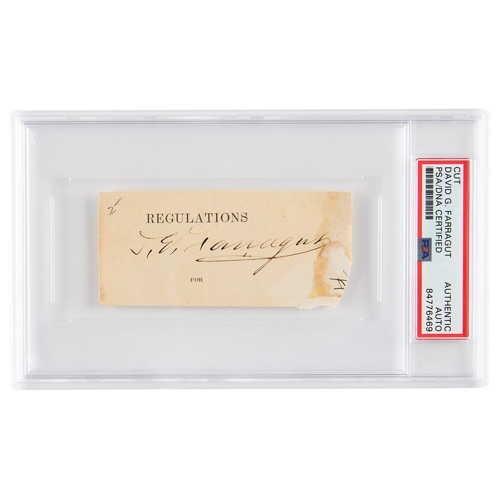 Ink signature, "D. G. Farragut,& rdquo; on an off-white 3.75 x 1.75 sheet clipped from a military document. In very good to fine condition, with staining and toning to the right side. Encapsulated in a PSA/DNA authentication holder.