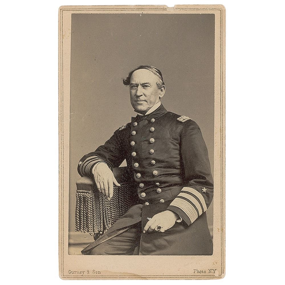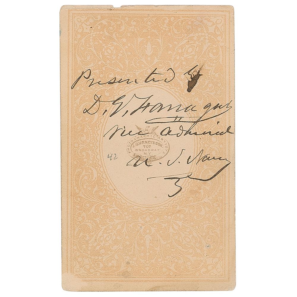 Sharp 2.5 x 4 carte-de-visite photo of Admiral Farragut in uniform by J. Gurney & Son of New York, signed on the reverse in ink, "Presented by D. G. Farragut, Vice Admiral, U.S. Navy." In fine condition, with trivial loss to the top edge, and a thin stain to the bottom edge.