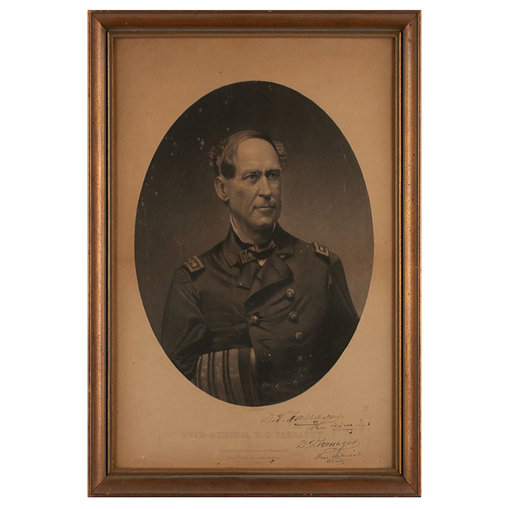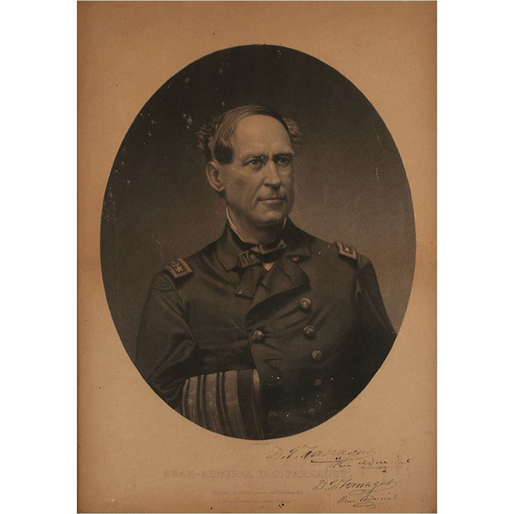 American admiral (1801–1870) who was a flag officer of the Navy during the Civil War. Scarce oversized 11 x 15.75 print of Rear-Admiral David G. Farragut in uniform, published by C. B. Richardson, signed in the lower right in ink, "D. G. Farragut, Rear Admiral." Also bears a facsimile signature. Framed to an overall size of 13 x 17.5; a label on the reverse reads: "Property of J. A. E. S. Brainard, belonged to Gideon Welles." In very good to fine condition, with two edge tears, one of which passes through Farragut's last name.