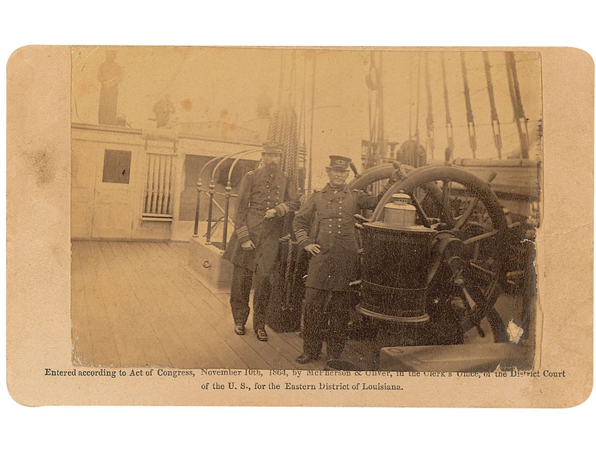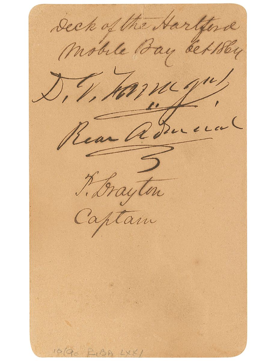 Exceedingly scarce original 4 x 2.5 carte-de-visite photo of Farragut and Drayton on the deck of the Hartford in 1864, signed on the reverse in black ink, “D. G. Farragut, Rear Admiral,” and “P. Drayton, Captain.” Reverse also bears a notation in another hand, “Deck of the Hartford, Mobile Bay, Oct 1864.” In very good condition, with tear to right edge of border and image, image slightly peeling off backing, scattered light silvering and toning to reverse.