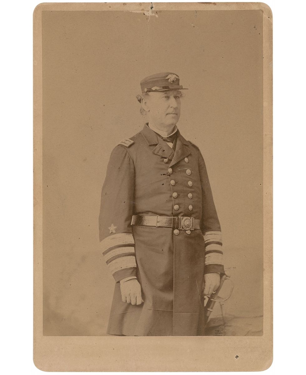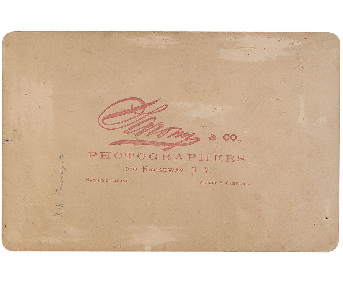 American admiral (1801–1870) who was a flag officer of the Navy during the Civil War. Original circa 1860s albumen cabinet card of Farragut in uniform, 4.25 x 6.5, by Napoleon Sarony of New York. Two pinholes to mount, pencil notes to reverse, and overall toning.