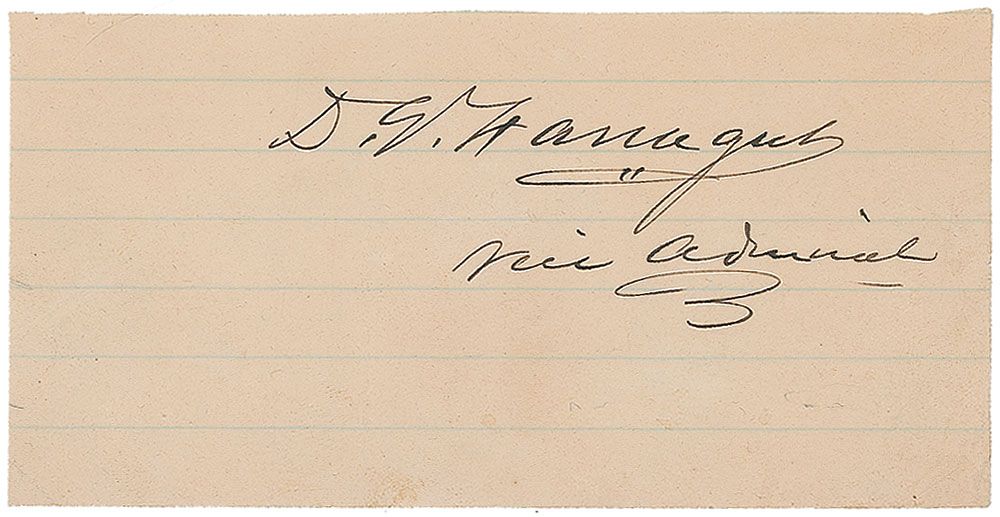 Ink signature, “D. G. Farragut, Vice Admiral,” on an off-white 4.5 x 2.25 lightly-lined slip. In fine condition.