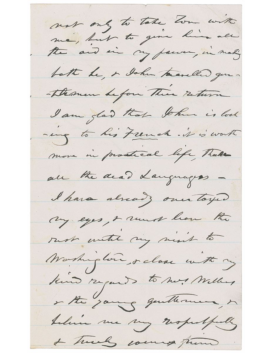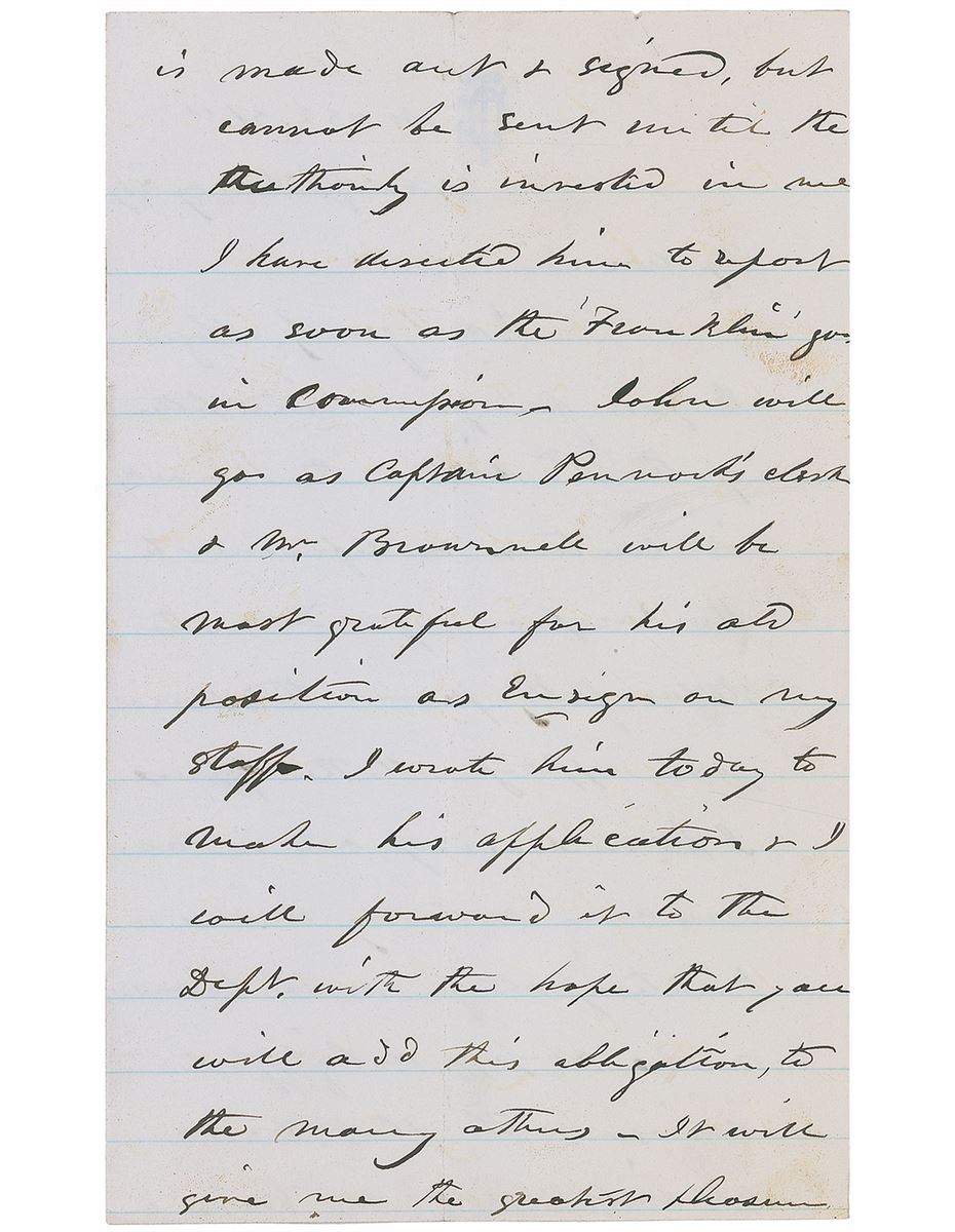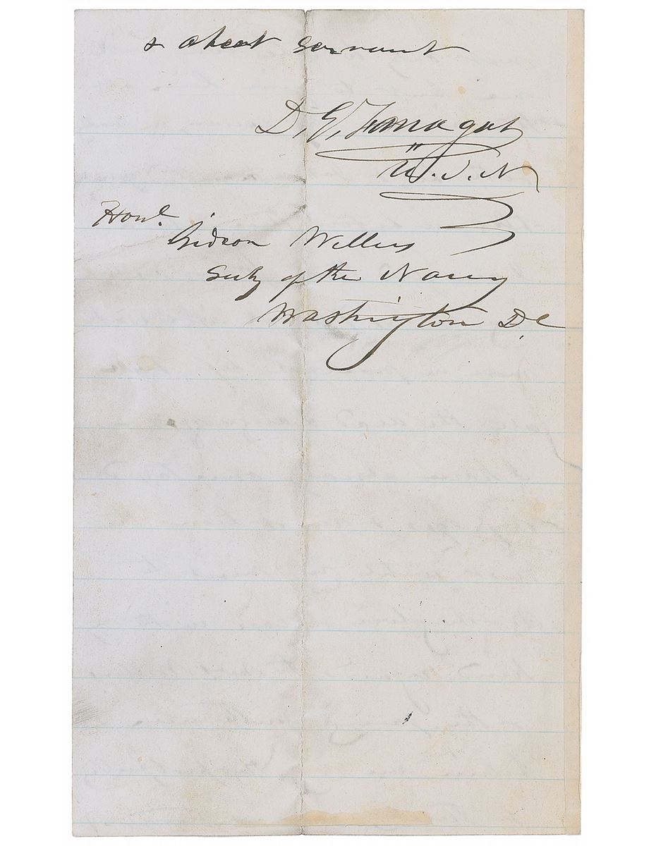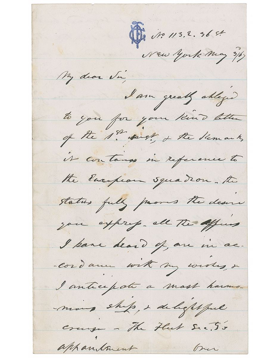 ALS signed “D. G. Farragut,” four pages, lightly-lined on two adjoining sheets, 5 x 8, personal monogrammed letterhead, May 3, 1867. Letter to Secretary of the Navy Gideon Welles. In part: “I am greatly obliged to you for your kind letter…& the Remark it contains in reference to the European squadron—the status fully proves the desire you express. All the affairs I have heard of, are in accordance with my wishes, & I anticipate a most harmonious ship, & delightful cruise. The Fleet Secty’s appointment is made out & signed, but cannot be sent until the authority is invested in me. I have directed him to report as soon as the Franklin goes in commission. John will go as Captain Pennock’s clerk…I am glad that John is looking to his French—it is worth more in practical life, than all the dead Languages.” In very good condition, with a noticeable vertical fold passing through the first letter of the signature, scattered soiling, and a mounting strip to the right edge of the last page. Farragut was named commander of the European Squadron in April 1867 with the USS Franklin as his flagship.