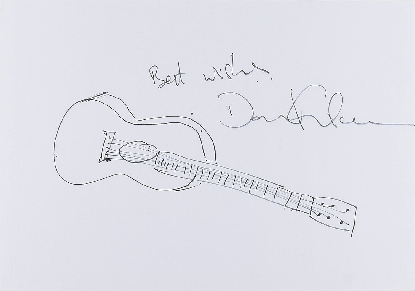 Original felt tip sketch by David Gilmour of an acoustic guitar on a white 16.5 x 11.5 sheet, signed above by the Pink Floyd guitarist, "Best wishes, David Gilmour." In fine condition, with a light crease to the upper right corner. Consignor notes that Gilmour made this sketch at the Hay Festival in 2016 to be specially donated for a charity auction at the Clyro Primary School.
