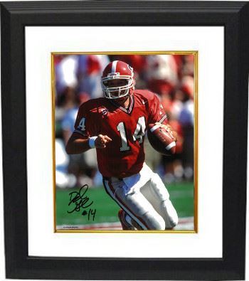 David Greene played quarterback at the University of Georgia in college. Greene finished his college career as the winningest quarterback in NCAA Division I history with 42 wins in four years, eclipsing the record previously held by Peyton Manning. However, on November 21, 2009, University of Texas quarterback Colt McCoy broke his record with a win over University of Kansas. Greene finished his college career as the Southeastern Conference all-time career leader in yards gained with 11,270 until that record was broken by Aaron Murray on October 5, 2013 against Tennessee. David Greene has hand signed this Georgia Bulldogs 8x10 Photo. Certificate of Authenticity from Athlon Sports. Custom White Mat and Premium Black Frame as shown.