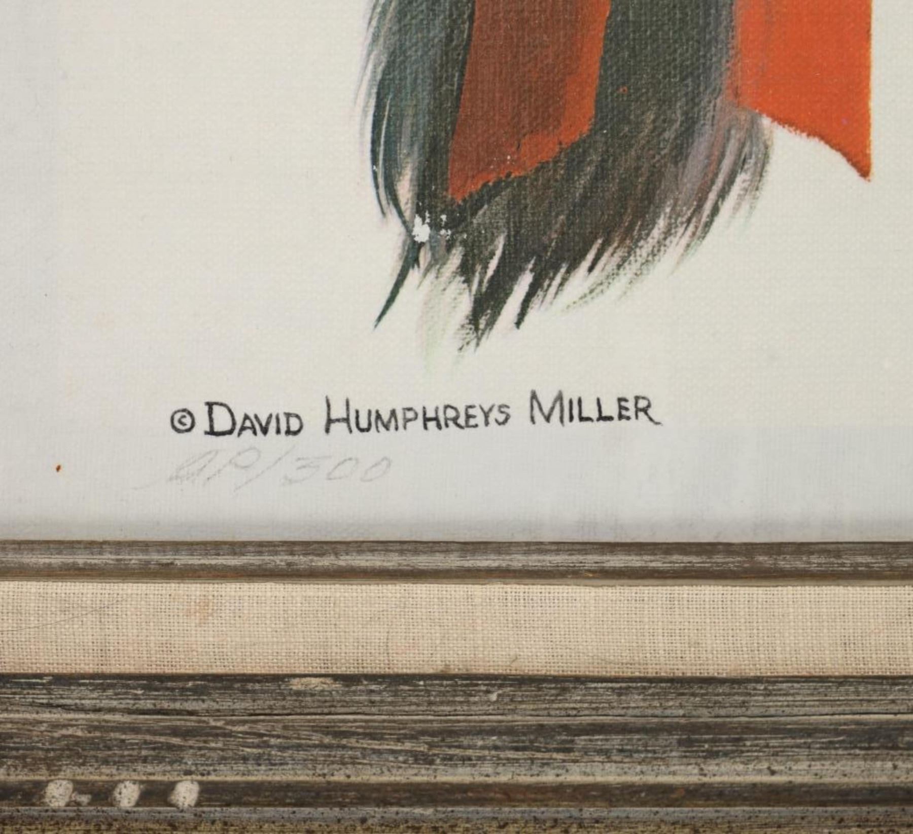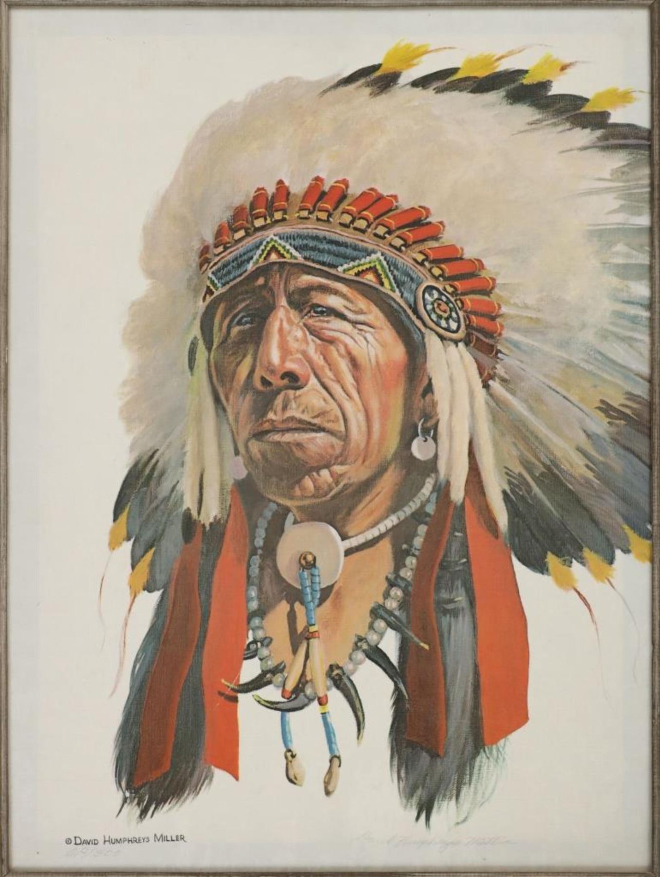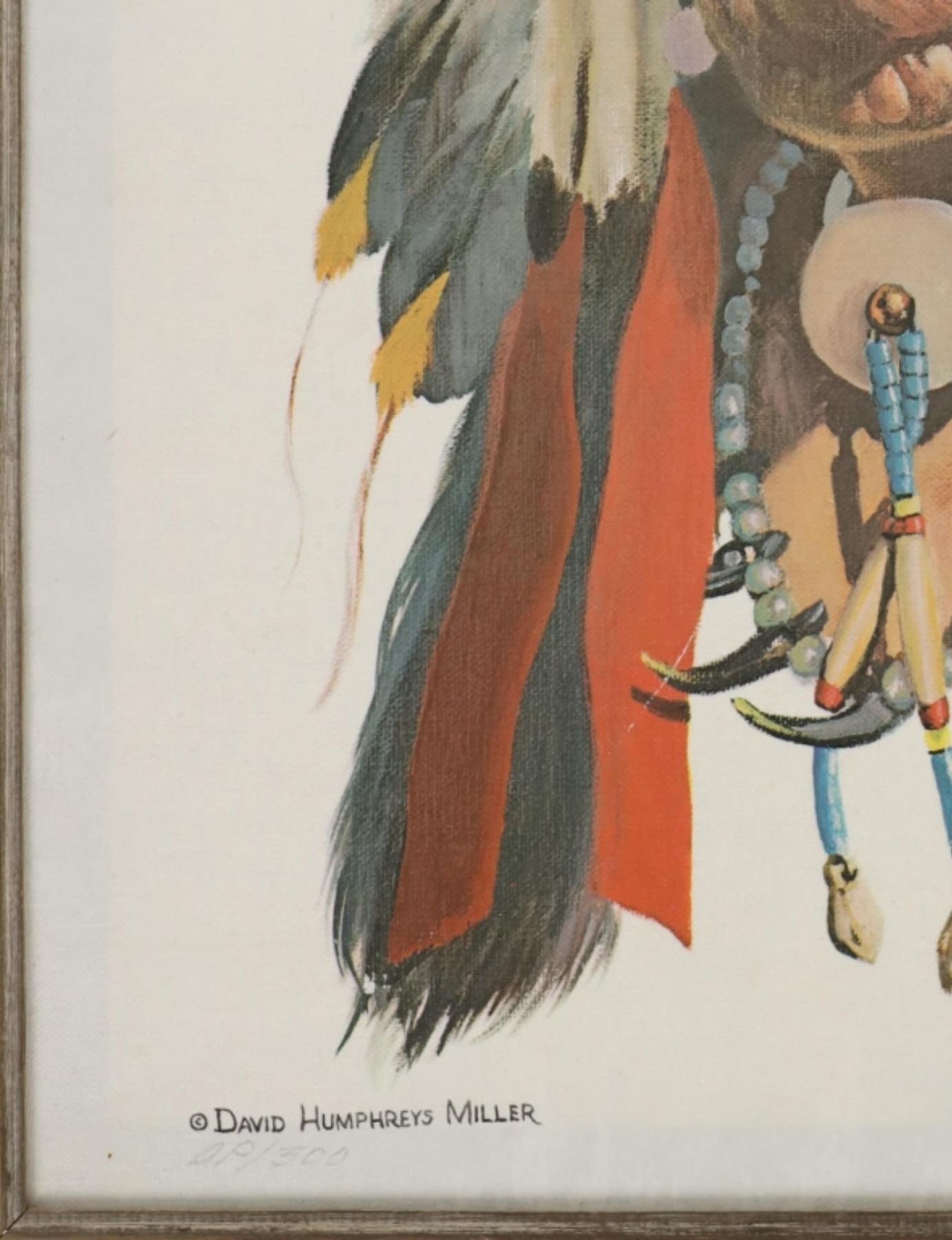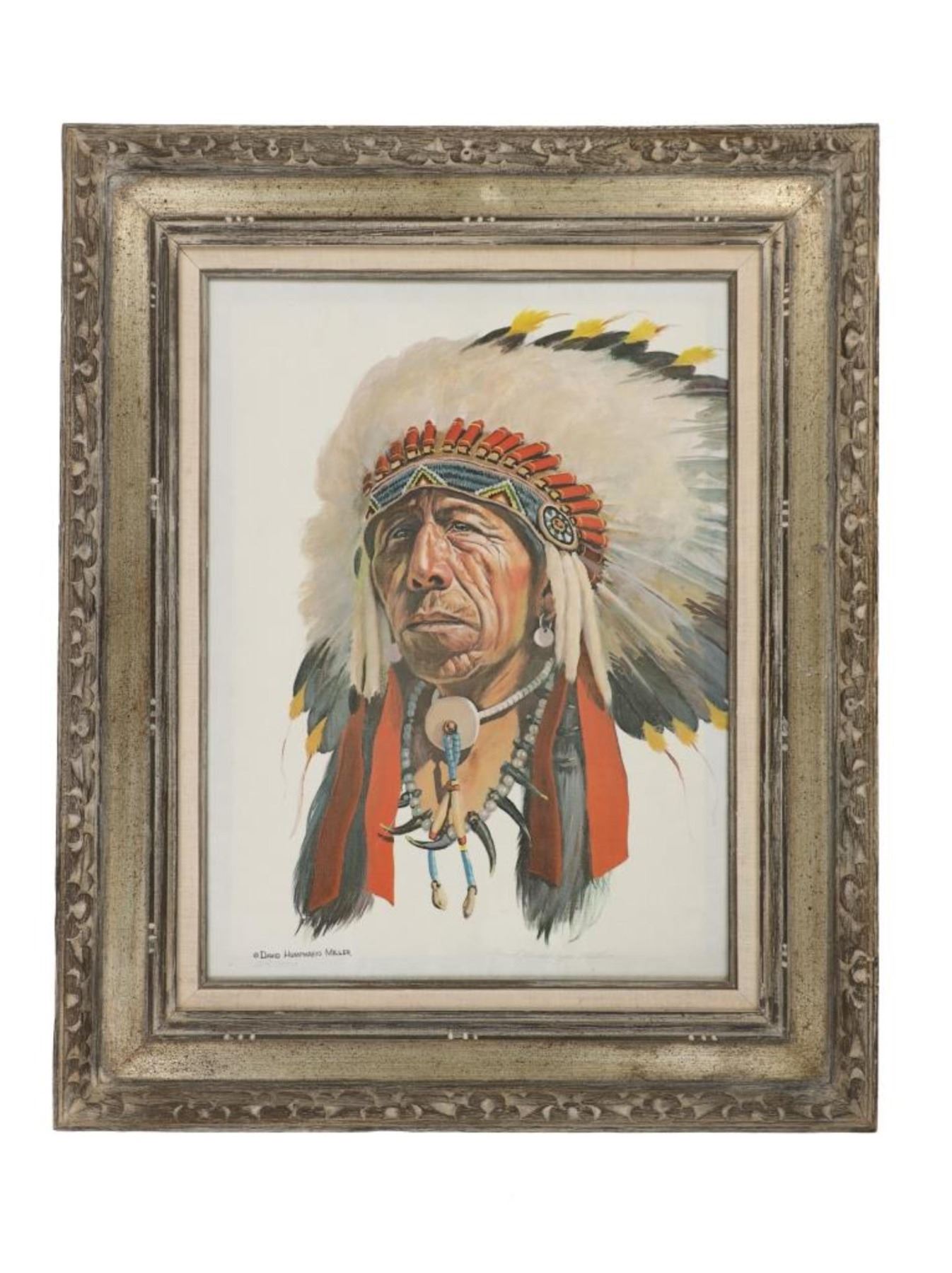 Featured in this lot is this beautiful artist proof, giclee print titled, "Black Elk" originally painted by renowned artist David Humphreys Miller (1918 - 1992) circa 1950-60s. Miller was born in Van Wert, Ohio, to an artistic family. He spent most of his childhood sketching and painting to hone his artistic abilities. He initially visited the Pine Ridge Reservation in South Dakota at the age of 16, accompanied by a translator, and began interviewing the remaining Battle of Little Bighorn survivors, the majority of whom were over 70 years old. Most of them had never told their stories to a white man. Because Indian warriors made up the vast majority of the fight survivors, these many interviews were critical to later historical research on Custer's defeat. He went on to study art at the University of Michigan, New York University, and the Grand Central School of Art with Harvey Dunn. He also collaborated privately with Winold Reiss, continuing his work on the Bighorn survivors with his family's permission over the summer. In 1942, he joined the 14th Air Corps in China during World War II. Miller expanded his knowledge of the Plains peoples by learning 14 Indian languages, including sign language, and being adopted by 16 different Indian households. Black Elk eventually named him Chief Iron White Man after the Oglala Sioux medicine man who had been at Little Bighorn. He eventually worked as a technical advisor on 25 "Western" films. Miller, a close friend of Korezak Ziolkowski, planned the final meeting of the surviving eight Bighorn survivors on June 3, 1948, at the dedication of the Crazy Horse Memorial. In 1971, he authored a lengthy piece for American Heritage magazine about Custer survivors' recollections. Miller and his wife, Jan, spent their latter years in Rancho Santa Fe, California, where he painted and wrote until he died in 1992. Black Elk was, cousin of famous war chief Crazy Horse, and veteran not only of Battle of Little Big Horn, but also the Wounded Knee Massacre, and Buffalo Bill's Wild West Show. Nicholas Black Elk also revived the traditional Oglala Sun Dance. Nicholas, and his son Benjamin were crucial proponents in the education of the Lakota Sioux tradition, keeping it alive not only on the reservation, but spreading the culture to all peoples. This artist proof giclee print shows Black Elk posing for a portrait as he wears a large war bonnet and bear claw necklace. He is looking to the left of the viewer with a stoic look on his face. The piece is signed twice by the artist, once from the print in black lettering and once in pencil by hand reading, "David Humphreys Miller". It is also numbered reading, "AP/300" showing that it is a limited edition artist proof print. The piece is set in a wood frame showing white and grey colors throughout and carved designs. The artwork and frame show good condition overall with little to no wear present on the artwork and no signs of major damage noted. The visible art measures 23 5/8" L x 17 1/2" W, while the entire piece measures 32 5/8" L x 26 1/2" W x 2 3/4" D. It has a total weight of 6 pounds and 12 ounces.