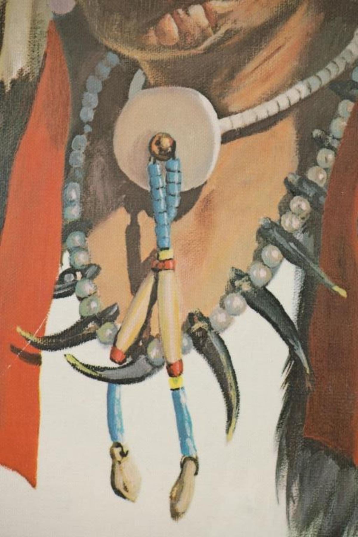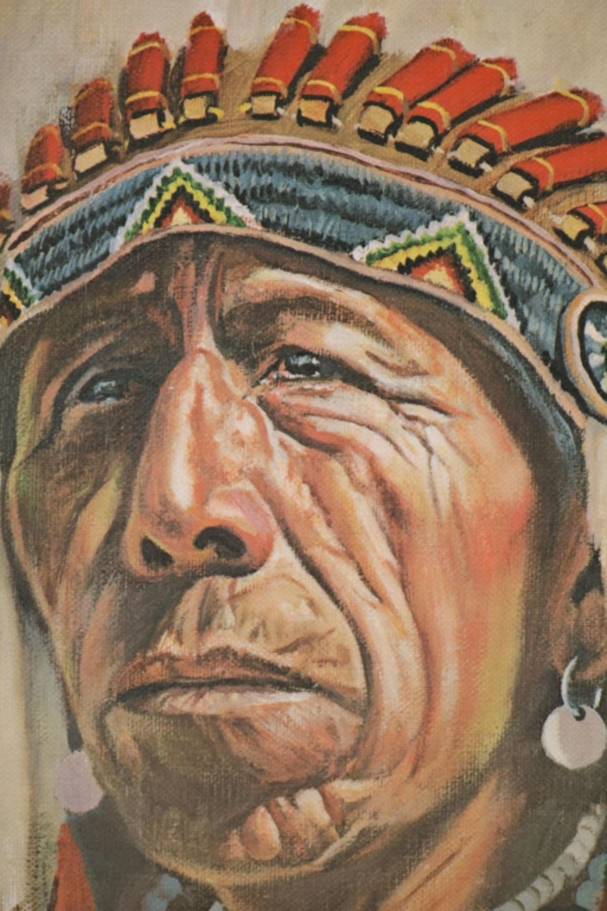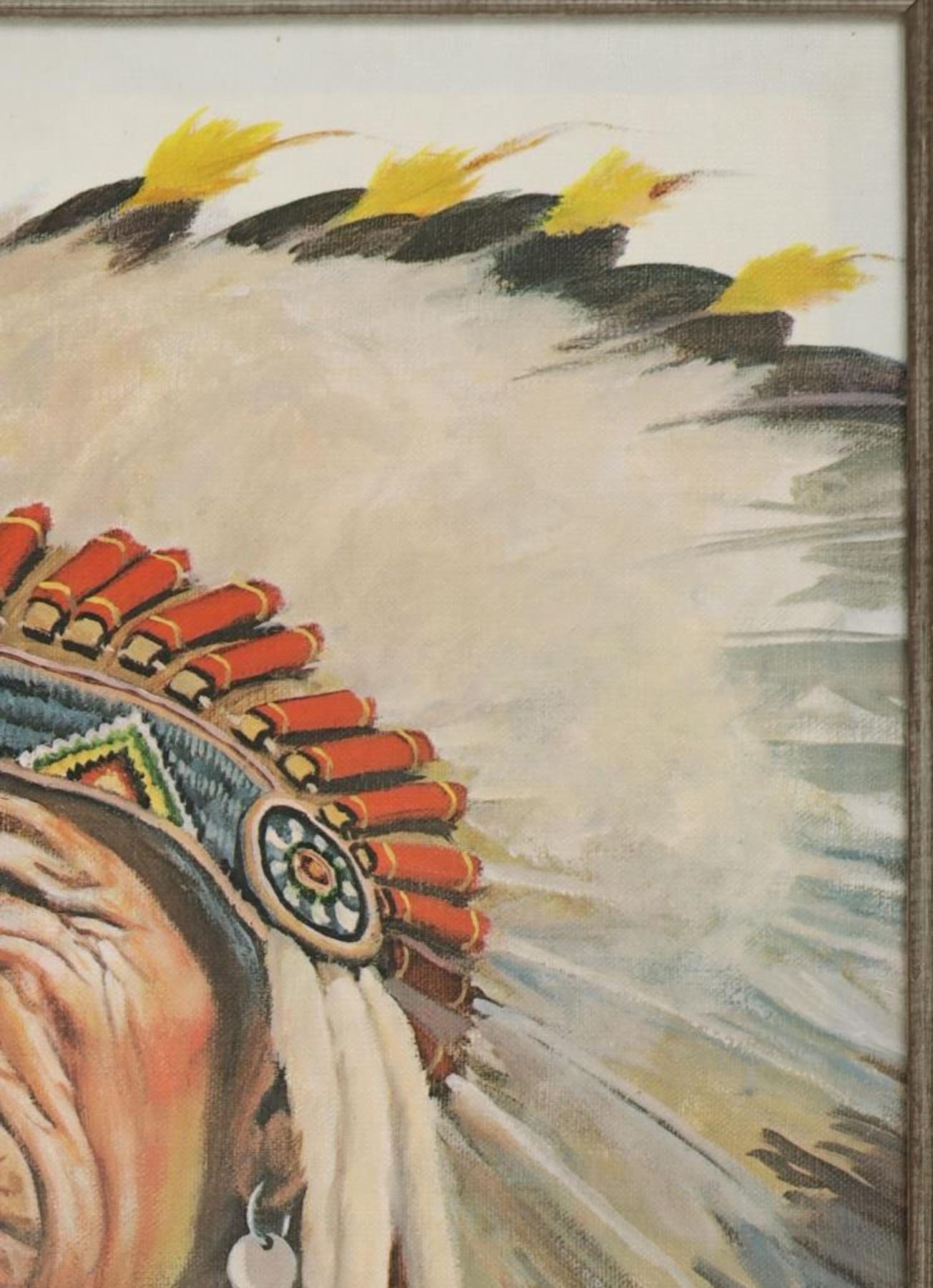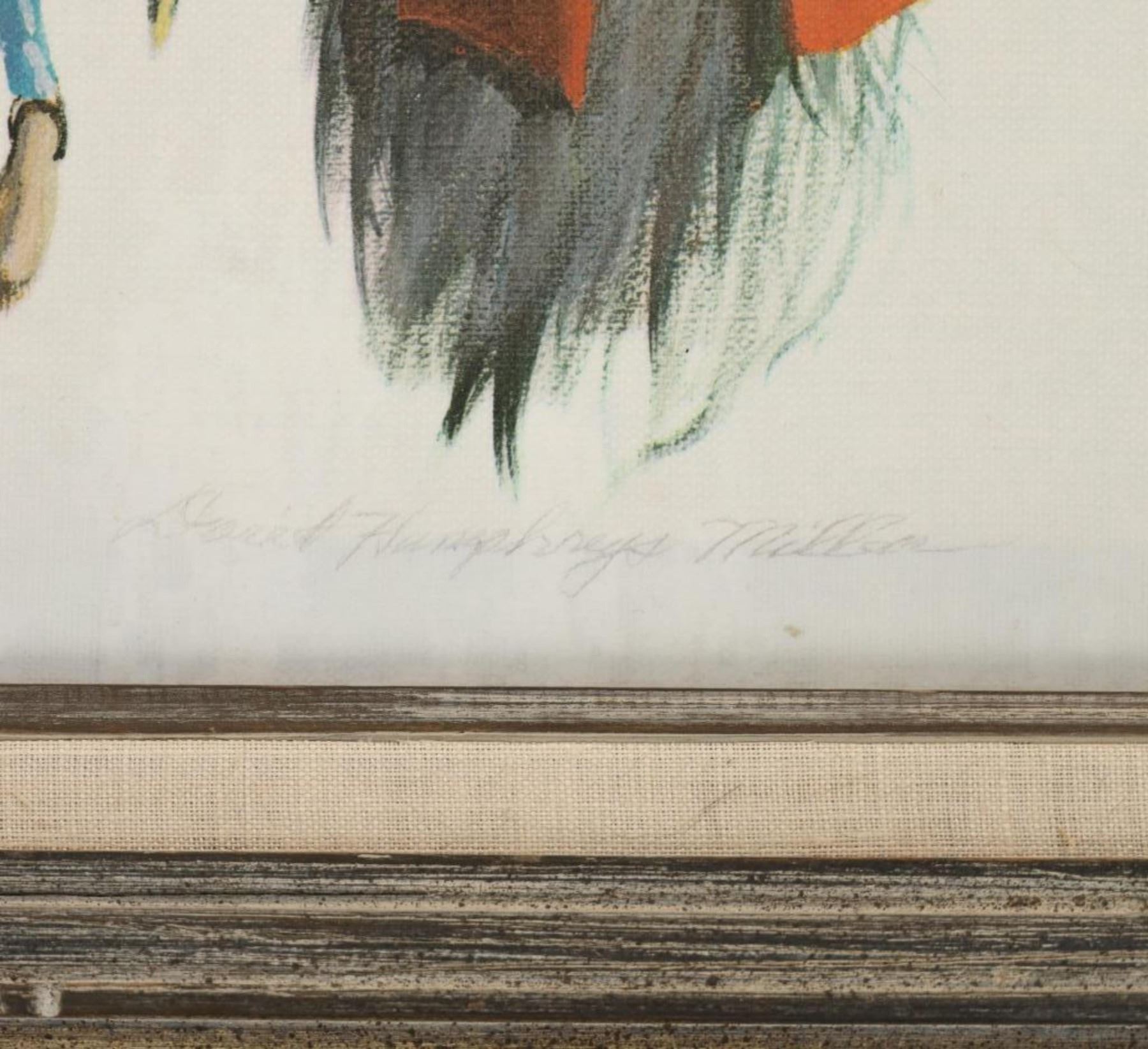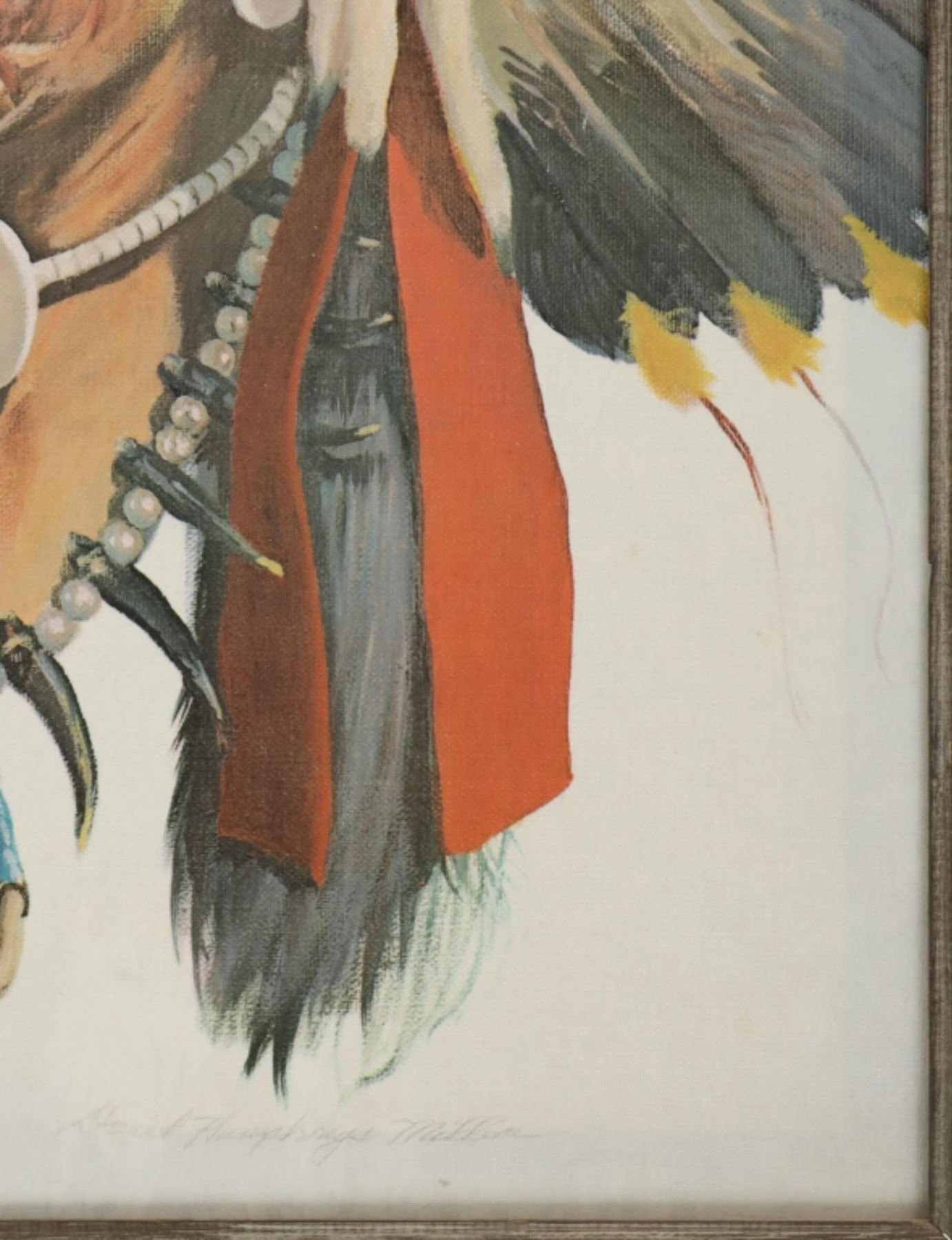 Featured in this lot is this beautiful artist proof, giclee print titled, "Black Elk" originally painted by renowned artist David Humphreys Miller (1918 - 1992) circa 1950-60s. Miller was born in Van Wert, Ohio, to an artistic family. He spent most of his childhood sketching and painting to hone his artistic abilities. He initially visited the Pine Ridge Reservation in South Dakota at the age of 16, accompanied by a translator, and began interviewing the remaining Battle of Little Bighorn survivors, the majority of whom were over 70 years old. Most of them had never told their stories to a white man. Because Indian warriors made up the vast majority of the fight survivors, these many interviews were critical to later historical research on Custer's defeat. He went on to study art at the University of Michigan, New York University, and the Grand Central School of Art with Harvey Dunn. He also collaborated privately with Winold Reiss, continuing his work on the Bighorn survivors with his family's permission over the summer. In 1942, he joined the 14th Air Corps in China during World War II. Miller expanded his knowledge of the Plains peoples by learning 14 Indian languages, including sign language, and being adopted by 16 different Indian households. Black Elk eventually named him Chief Iron White Man after the Oglala Sioux medicine man who had been at Little Bighorn. He eventually worked as a technical advisor on 25 "Western" films. Miller, a close friend of Korezak Ziolkowski, planned the final meeting of the surviving eight Bighorn survivors on June 3, 1948, at the dedication of the Crazy Horse Memorial. In 1971, he authored a lengthy piece for American Heritage magazine about Custer survivors' recollections. Miller and his wife, Jan, spent their latter years in Rancho Santa Fe, California, where he painted and wrote until he died in 1992. Black Elk was, cousin of famous war chief Crazy Horse, and veteran not only of Battle of Little Big Horn, but also the Wounded Knee Massacre, and Buffalo Bill's Wild West Show. Nicholas Black Elk also revived the traditional Oglala Sun Dance. Nicholas, and his son Benjamin were crucial proponents in the education of the Lakota Sioux tradition, keeping it alive not only on the reservation, but spreading the culture to all peoples. This artist proof giclee print shows Black Elk posing for a portrait as he wears a large war bonnet and bear claw necklace. He is looking to the left of the viewer with a stoic look on his face. The piece is signed twice by the artist, once from the print in black lettering and once in pencil by hand reading, "David Humphreys Miller". It is also numbered reading, "AP/300" showing that it is a limited edition artist proof print. The piece is set in a wood frame showing white and grey colors throughout and carved designs. The artwork and frame show good condition overall with little to no wear present on the artwork and no signs of major damage noted. The visible art measures 23 5/8" L x 17 1/2" W, while the entire piece measures 32 5/8" L x 26 1/2" W x 2 3/4" D. It has a total weight of 6 pounds and 12 ounces.