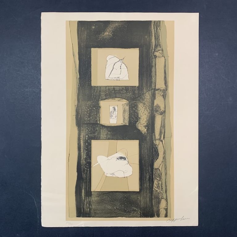 David H. Oppenheim's "Obsession" limited edition print, signed lower right and numbered 78/99 lower left. This an interesting almost abstract-like style, in blacks, light browns, and whites. This piece is in near excellent condition, with very small 4mm incision lower right.