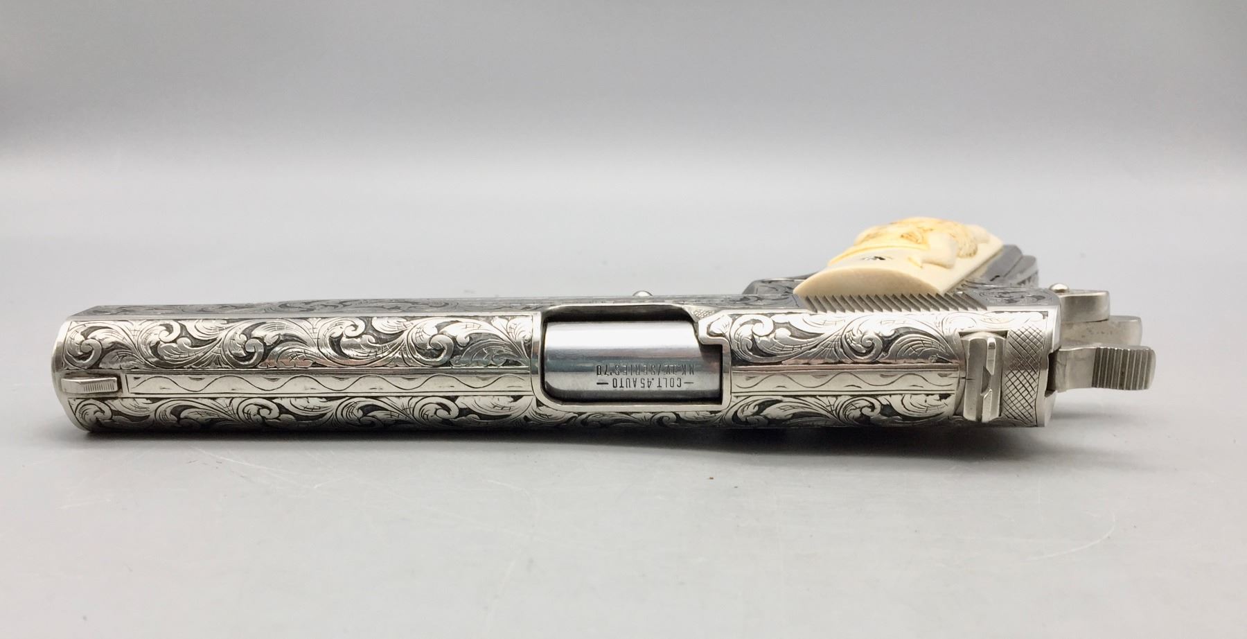 Description: Presented for your consideration is this engraved Colt .45 acp, semi-automatic, M 1911 Colt pistol. It features "Deep Scroll" style engraving by the Master Engraver, David Wade Harris. This pistol features ivory grips, with a steer on one side. This gun comes with a letter from David W. Harris and it is a must see! Maker: Colt.