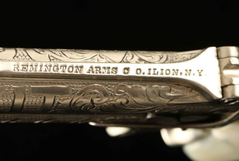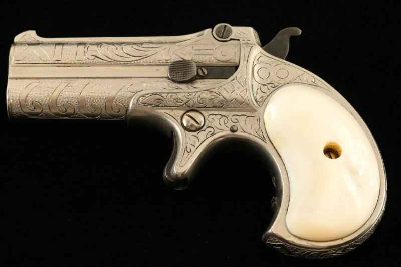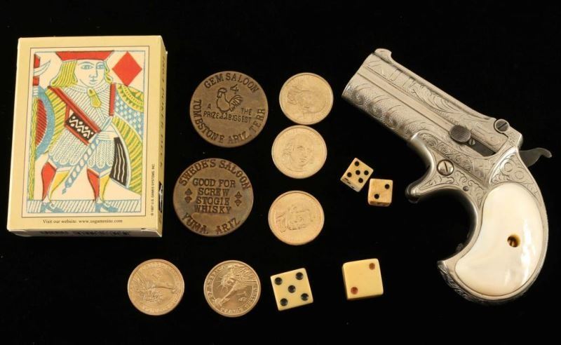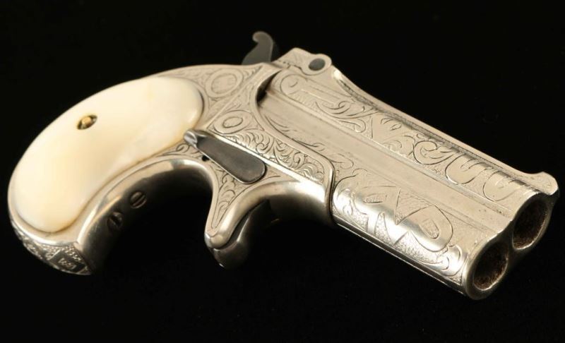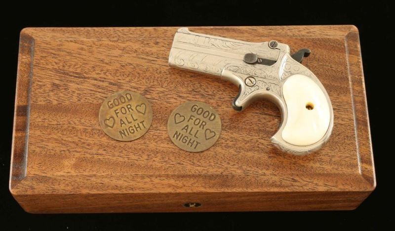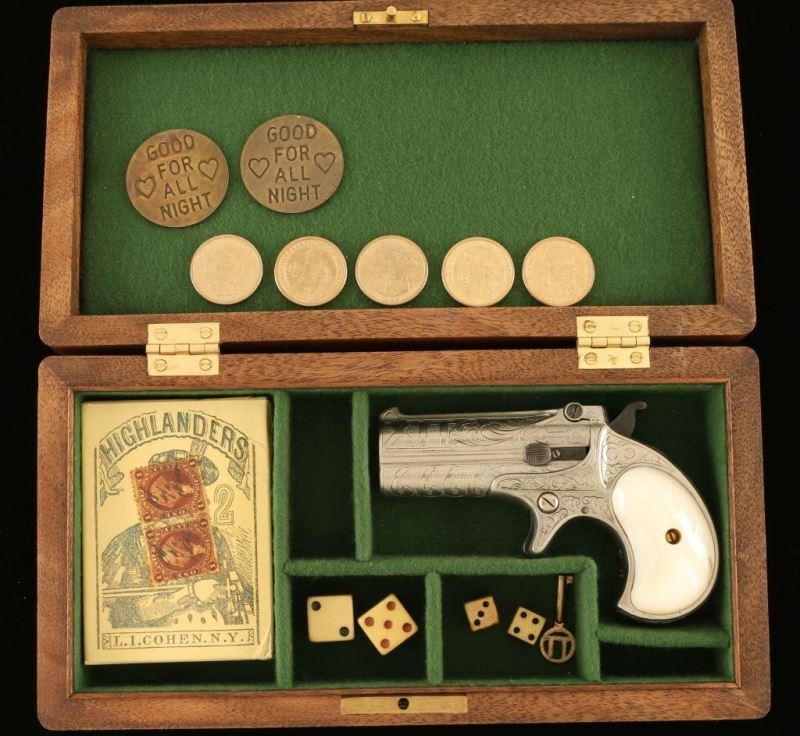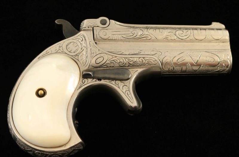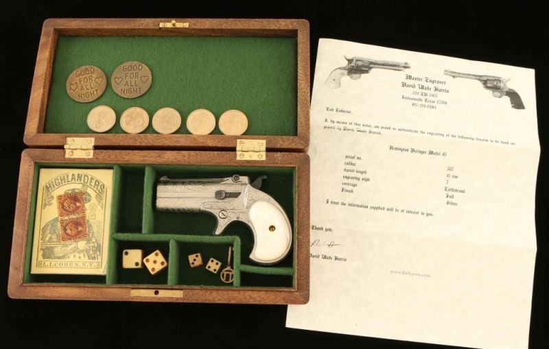 SN: 557 'Type II" Cased & engraved vintage over/under double barrel derringer chambered in .41 Rimfire, circa 1888-1911. This derringer has been fully engraved by master engraver David Wade Harris. Features a silver plated refinish, cattle brand & floral scroll engraving with a punch dot background, ribbed 3" barrels, fixed blade front sight, 'u' notched rear sight, manual extractor, smooth spur trigger, knurled hammer spur, and two-piece mother-of-pearl grips. Includes a African mahogany wood gambler case by Bill's Cases with green felt lined compartmentalized interior, a 1864 Poker Deck, two sets of dice, five Presidential Dollar coins, and two brass tokens for Arizona saloons/brothels. Also accompanying this derringer is a letter from David Wade Harris authenticating his work. Pistol exhibits nearly all of it's silver plating showing a few small scattered blemishes under the finish with no observed finish loss. The action performs well but the firing pin does not automatically switch from barrel to barrel, the hinge is good, markings are strong, bores are good and the mother-of-pearl grips are fine. Condition is NRA Excellent in case. ***C&R Firearm***