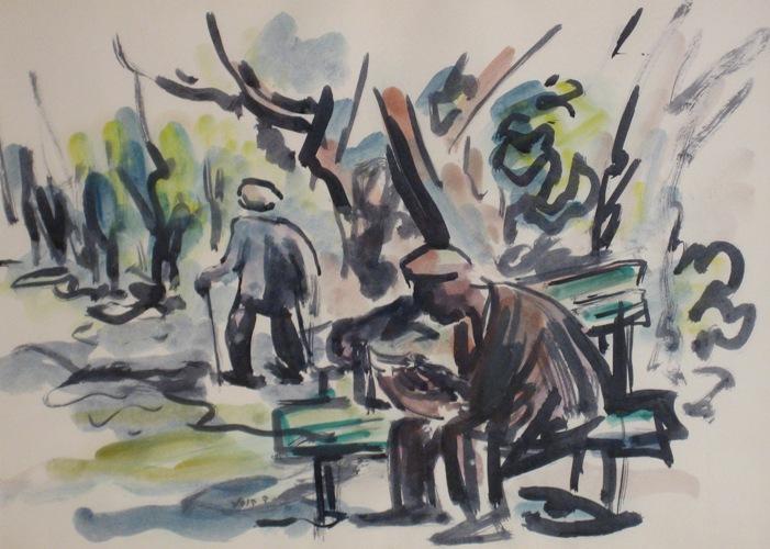 David Hendler, Israeli Art, 1904 - 1984, Figures in the Garden, Watercolor, 34x47cm, Signed., , , , ,