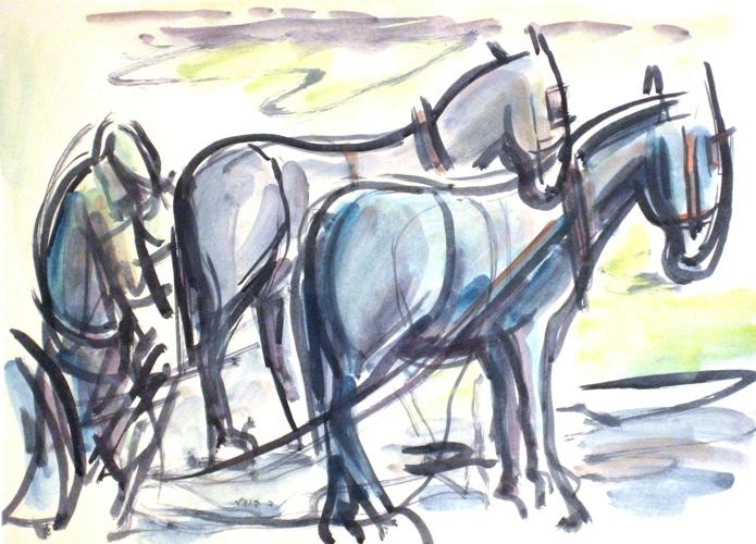 David Hendler, Israeli Art, 1904 - 1984, Carter and his Horses, Watercolor, 34x47cm, Signed., , , , ,