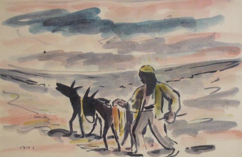 David Hendler, Israeli Art, 1904 - 1984, Figure and Donkeys, Watercolor, 32x49cm, Signed., , , , ,