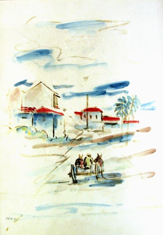 David Hendler, Israeli Art, 1904 - 1984, Donkeys in Neve Tzedek, Watercolor, 46x33cm, Signed., , , , ,