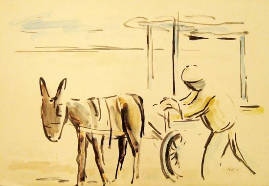 David Hendler, Israeli Art, 1904 - 1984, Coachman and Donkey, Watercolor, 35x50cm, Signed., , , , ,