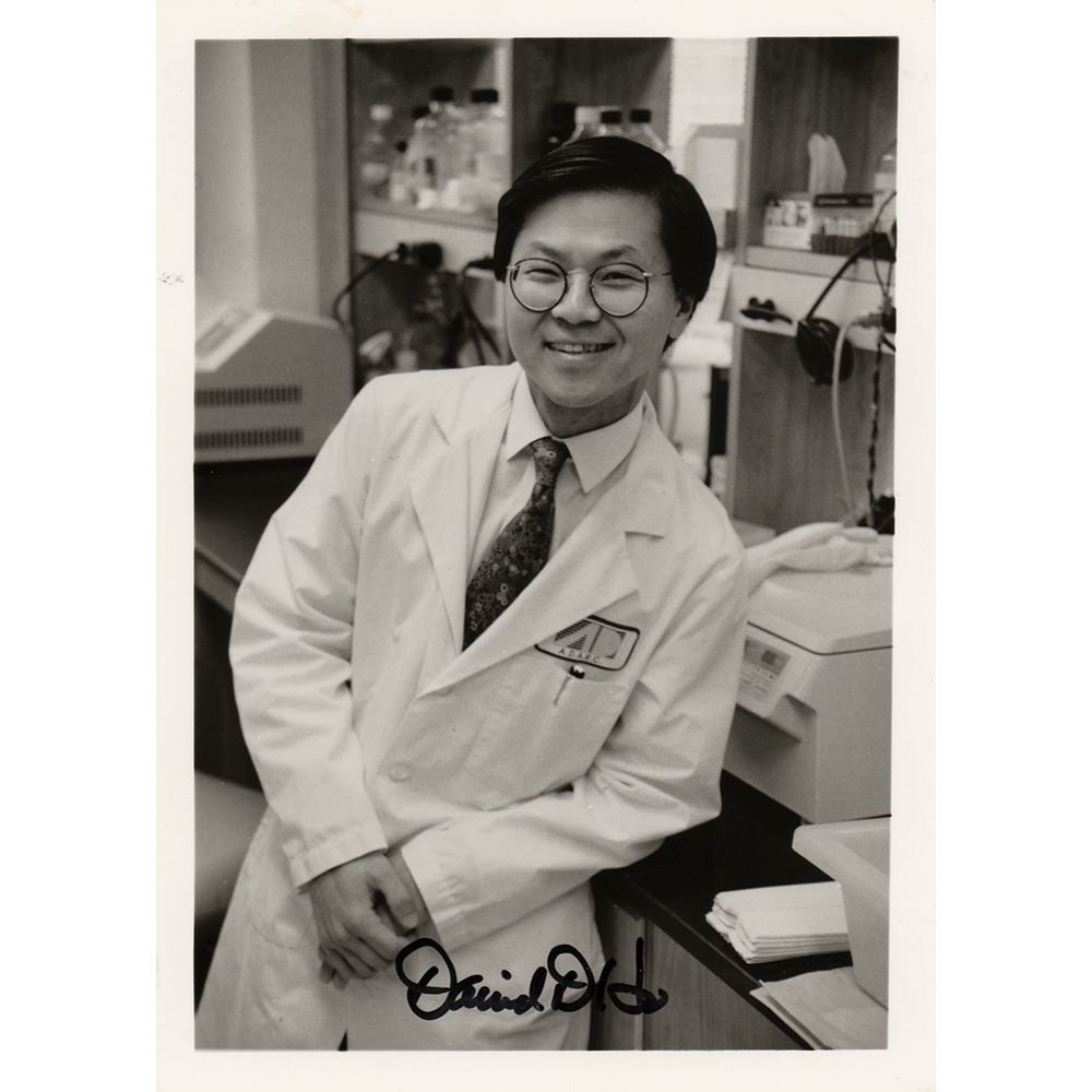 AIDS researcher, physician, and virologist (born 1952) known for his scientific contributions to the understanding and treatment of HIV infection. Glossy 5 x 7 photo of the important HIV/AIDS researcher in his lab coat, signed in black felt tip, "David D. Ho." In fine condition.