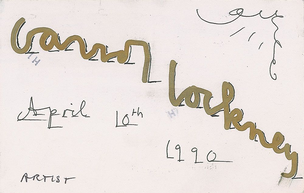 Creative gold ink and black felt tip signature, “David Hockney, April 10th, 1990,” on an off-white 5.5 x 3.5 card. In fine condition.