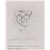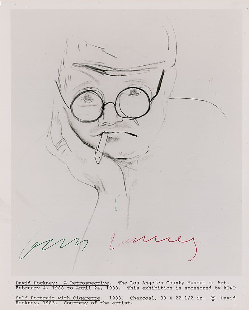 Glossy 8 x 10 photo of Hockney’s worked entitled ‘Self Portrait with Cigarette,’ signed in green ink, “David,” and red ink, “Hockney.” In fine condition, with slight skipping to ink at the start of his last name.