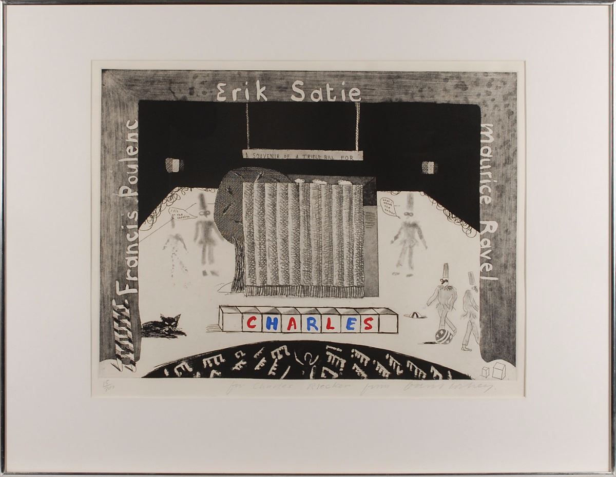Limited edition etching and aquatint with hand coloring in gouache, entitled ‘A Souvenir of a Triple Bill for Charles,’ 22 x 17, numbered 15/300, signed and inscribed in the lower border in pencil, “For Charles Riecker, from David Hockney.” Matted and framed to an overall size of 31 x 24. In fine condition. This outstanding print was made for the opening of the ballet Parade by Erik Satie at the Metropolitan Opera in New York. Hockney designed both sets and costumes for the three 20th–century French works that were offered at the Metropolitan Opera House under the embracing title ‘Parade.’ In addition to Satie’s ballet, the pieces included Les Mamelles de Tiresias, an opera with libretto by Guillame Apollinaire and music by Francis Poulenc, and L’Enfant et les Sortileges, an opera with libretto by Colette and music by Maurice Ravel.