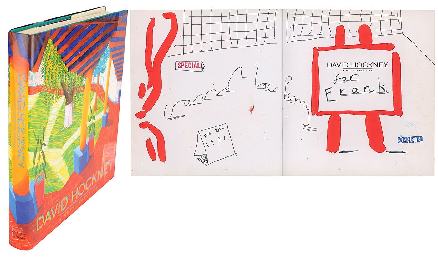 Signed book: David Hockney: A Retrospective. NY: Harry N. Abrams, Inc., 1988. Hardcover with dust jacket, 10.5 x 11.25, 288 pages. Signed and inscribed on both the half-title page and its adjacent page in black ink, "For Frank, David Hockney," who adds a sketch of a stand-up sign with date, "Feb 20th, 1991," and a checkered background. Additionally, Hockney has embellished both pages with orange paint. Signed pages are also stamped "Special" and "Completed." In fine condition, with adhesive residue and a tear to dust jacket. A beautifully illustrated book, containing a wonderful original work of art by the much celebrated British artist.