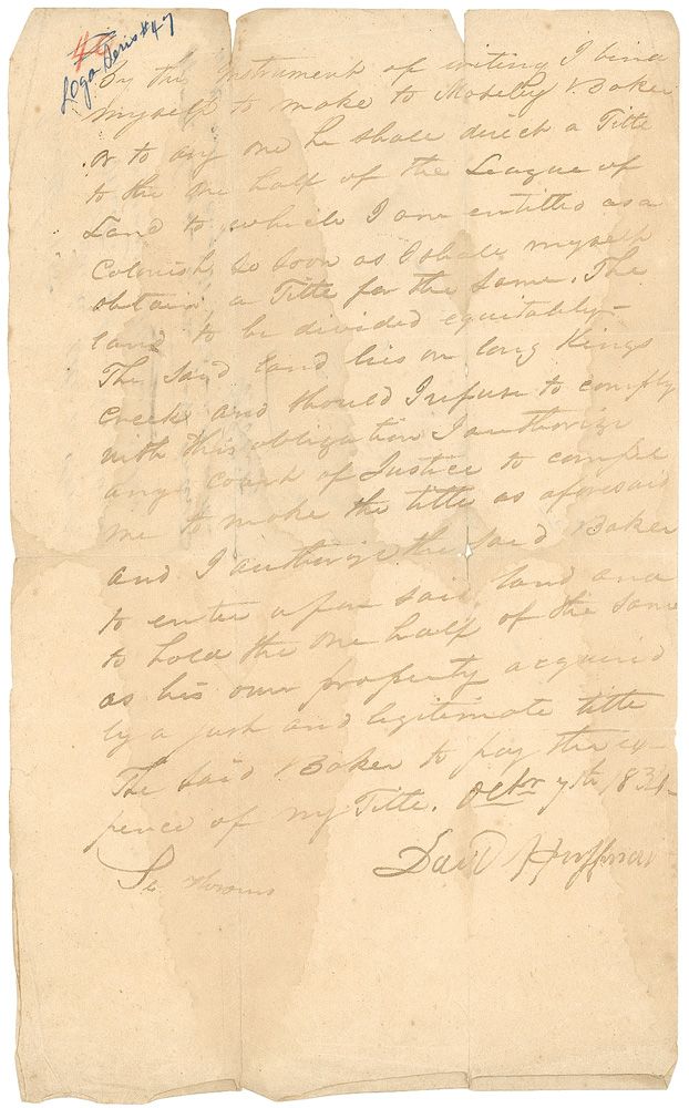 Texas settler for whom Huffman, Texas was named. Manuscript DS, one page, 7.75 x 12.5, October 7, 1834. Land grant reads, in part: “By this instrument of writing I bind myself to make to Moseley V. baker or to any one he shall direct a Title to the one half of the League of Land to which I am entitled as a colonist so soon as I shall myself obtain a Title for the same. The land to be divided equitably—The said land lies on Long King’s Creek and should I refuse to comply with this obligation, I authorize any Court of Justice to make the title as aforesaid.” Reverse is docketed and signed by Moseley Baker and Samuel Whiting. In good condition, with partial separations and small areas of paper loss along intersecting folds, a vertical fold through a single letter of signature, damp staining to portions of document, scattered creases and wrinkles, and an ink notation to top left. The Robert Davis Collection.
