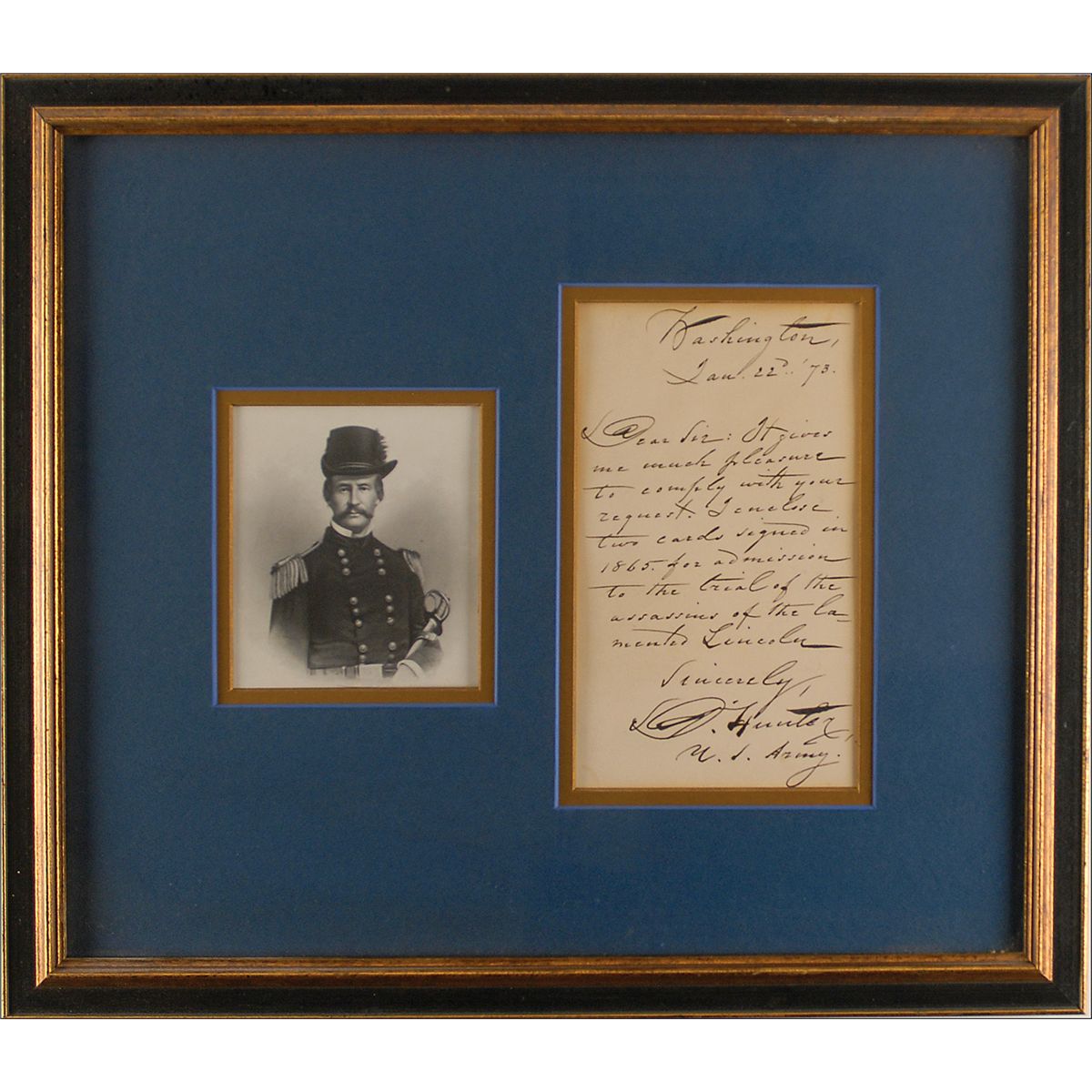 President of the military commission trying the conspirators involved with the assassination of President Abraham Lincoln. ALS signed “D. Hunter, U. S. Army,” one page, 4.5 x 7.75, January 22, 1879. Letter to an unidentified gentleman. In full: “It gives me much pleasure to comply with your request. I enclose two cards signed in 1865 for admission to the trial of the assassins of the lamented Lincoln.” Double matted and framed with an engraved portrait of Hunter in full uniform to an overall size of 17 x 15. In fine condition, with a uniform shade of toning. A remarkable letter with an uncommon direct reference to Abraham Lincoln.