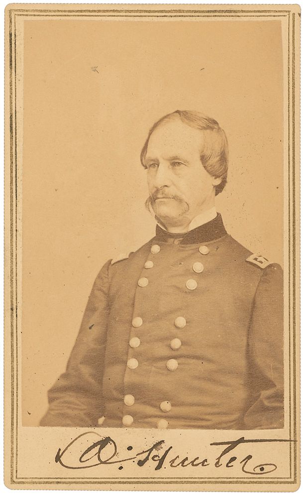 President of the military commission trying the conspirators involved with the assassination of President Abraham Lincoln (1802–1886). Original 2.25 x 4 carte-de-visite portrait of Hunter in uniform, by E. & H. T. Anthony of New York, signed in the lower border in black ink, “D: Hunter.” A couple mild creases, light silvering to dark areas of the image, and a trivial brush to the signature, otherwise fine condition.
