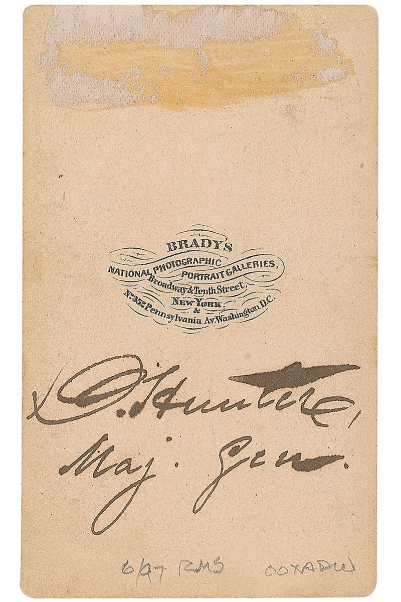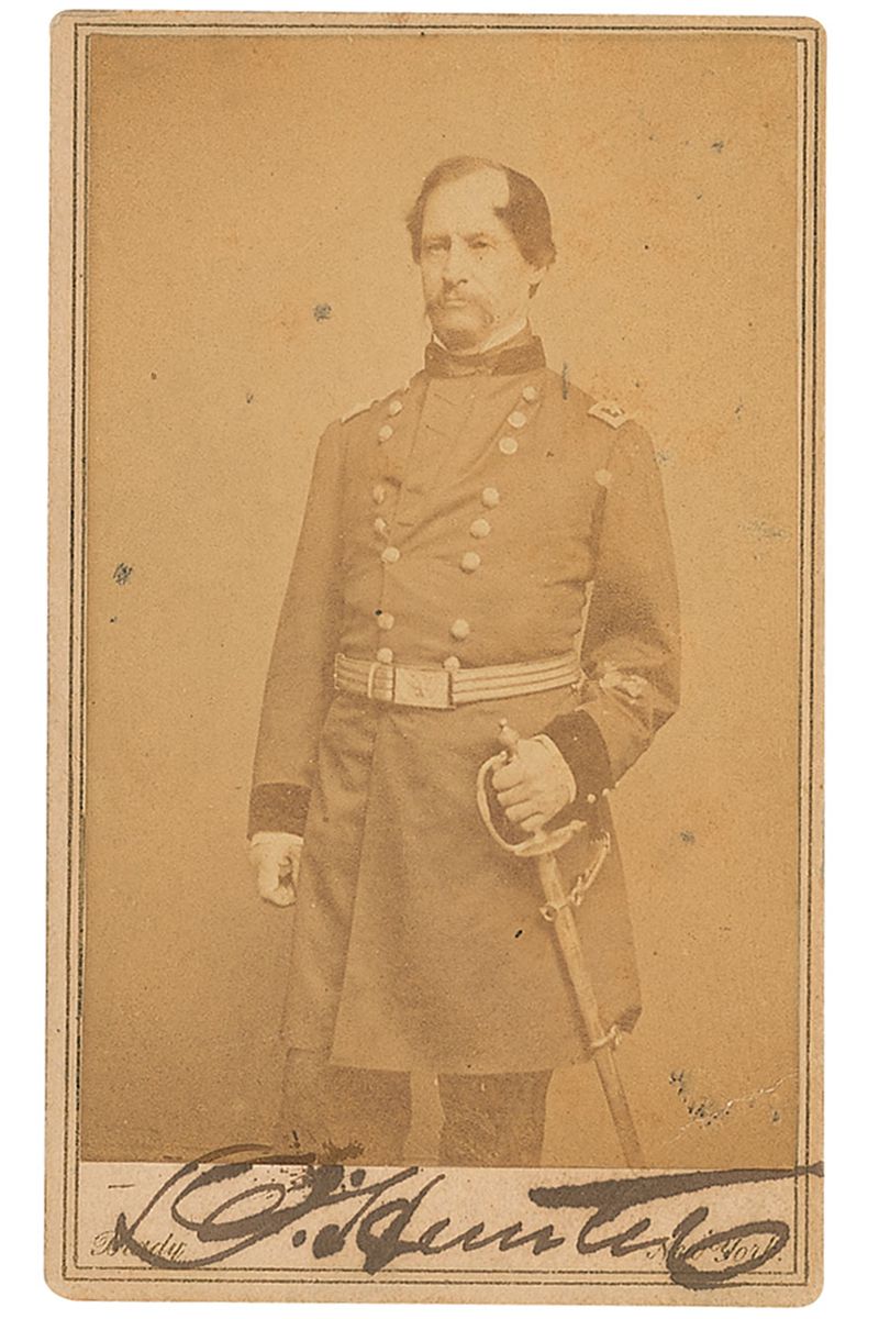 President of the military commission trying the conspirators involved with the assassination of President Abraham Lincoln (1802–1886). Original 2.5 x 4 carte-de-visite portrait of Hunter by Brady of New York, signed in the lower border in black ink, “D. H