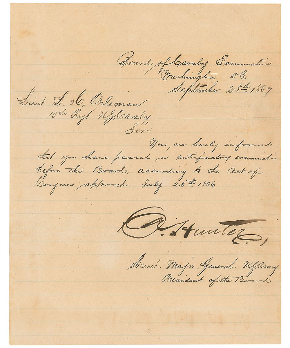 President of the military commission trying the conspirators involved with the assassination of President Abraham Lincoln. LS signed “D. Hunter,” one page, lightly-lined, 7.75 x 9.75, September 25, 1867. Letter to Lieutenant L. H. Orleman. In full: “You are hereby informed that you have passed a satisfactory examination before this Board according to the Act of Congress approved July 28th 1866.” In very good condition, with intersecting folds and scattered toning and dampstaining.
