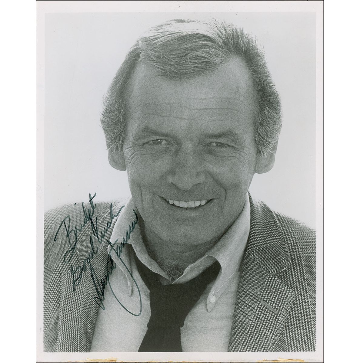 Scarce glossy 8 x 10 head-and-shoulders photo, signed and inscribed in black felt tip, “Bridget, Good luck, David Janssen.” Scattered light creasing, a small tack hole to the top edge, and adhesive remnants along the bottom edge from previous display, otherwise fine condition.