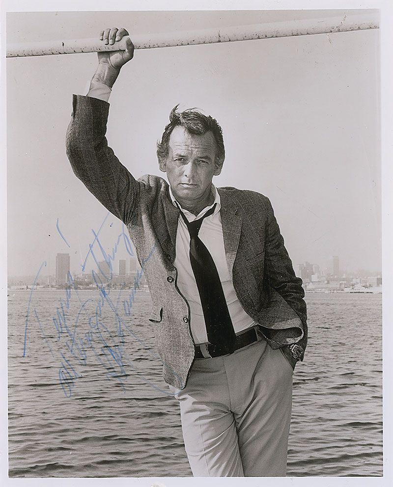 Glossy 8 x 10 photo of Janssen at the waterfront, signed and inscribed in blue felt tip, “Terry! All the good things, David Janssen.” Overall surface bends and creases, and the signature a shade light, otherwise fine condition.