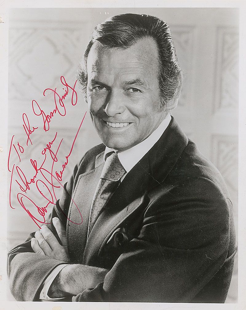 Glossy 8 x 10 photo, signed and inscribed in red felt tip, “To the Goss Family, Thank you, David Janssen.” In very good condition, with noticeable creases, some crazing to finish, and binder dings to left edge.
