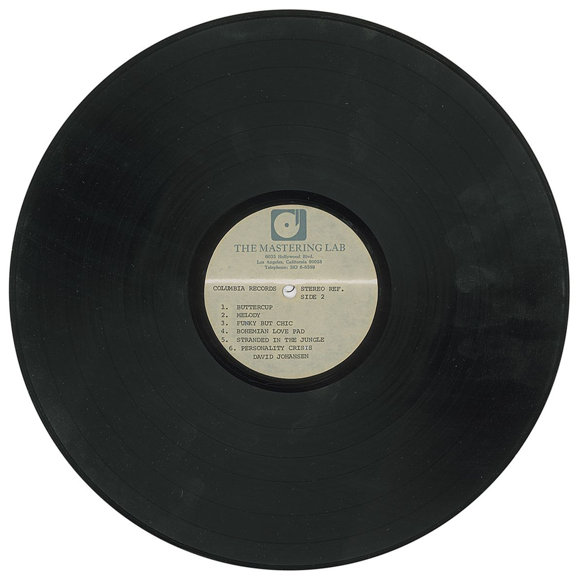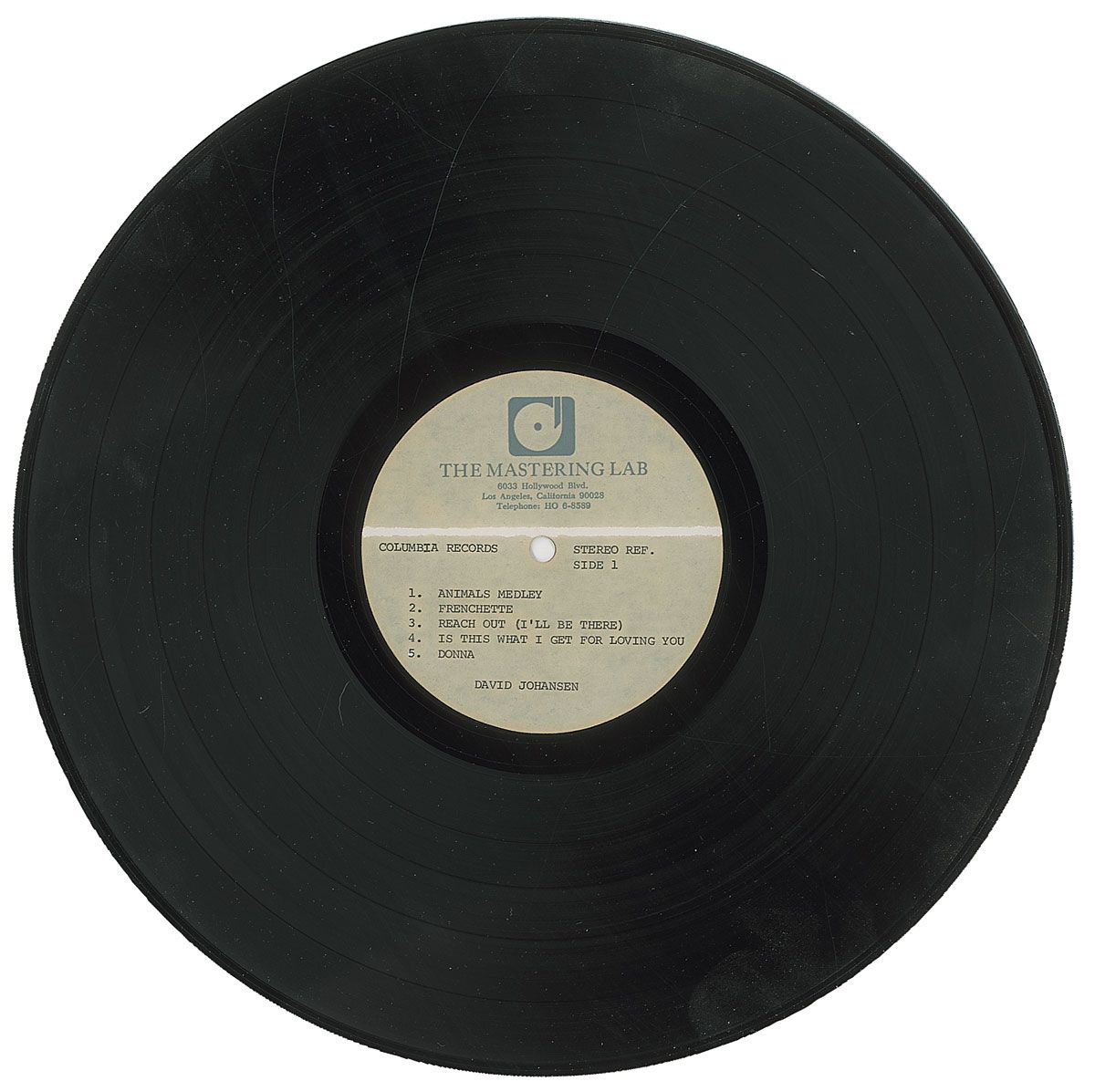 Two Columbia Records single-sided 12? acetates of Johansen’s 1982 live album Live It Up, each disc featuring one side of the final record. Both are identified in type on The Mastering Lab labels with relevant track listings and artist info. In very good condition, with moderate noticeable surface cracks and scratches to the side one record, and similar scratches to blank reverse of side two. Accompanied by the original sleeve from The Mastering Lab.