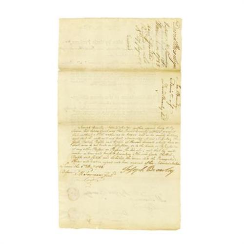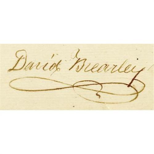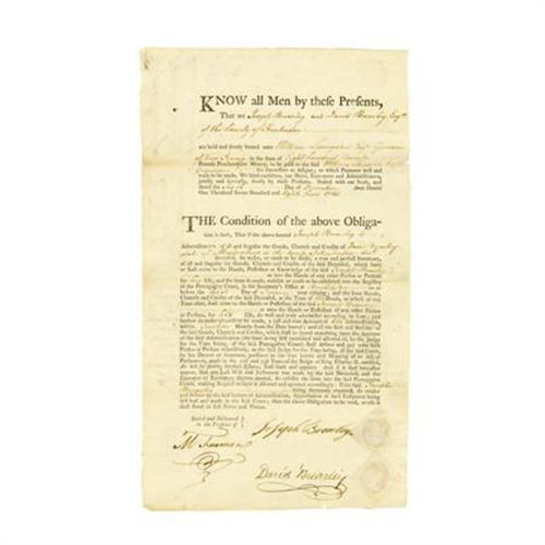 <B>David Brearley Partly Printed Document Signed</B></I> "<I>David Brearley</B></I>" and "<I>Joseph Brearley,</B></I>" "<I>M. Furman</B></I>" as witness, one page, 7.75" x 13.25". Hunterdon County, New Jersey, December 6, 1785. In part, "<I>Know all Men by these Presents, That we Joseph Brearley and David Brearley Esqrs of the County of Hunterdon are held and firmly bound unto William Livingston Esqr Governor of New Jersey in the Sum of Eight hundred Pounds Proclamation Money…The Condition of the above Obligation is such, That if the above-bound Joseph Brearley Administrator of all and singular of the Goods, Chattels and Credits of David Brearley Late of Maidenhead in the County of Hunterdon deceased, do make, or cause to be made, a true and perfect Inventory, of all and singular the Goods, Chattels and Credits of the said Deceased…do well and truly administer according to Law…pursuant to the true Intent and Meaning of an Act of Parliament, made in the 22d and 23d Years of the Reign of King Charles II, entitled, An Act for settling Intestate Estates, shall limit and appoint. And if it shall hereafter appear, that any Last Will and Testament was made by the said Deceased, and the Executor or Executors therein named, do exhibit the same into the said Prerogative Court, making Request to have it allowed and aproved sic accordingly…then the above Obligation to be void…</B></I>" Docketed on verso with additional Manuscript Document Signed "<I>Joseph Brearley,</B></I>" a sworn affidavit saying "<I>that David Brearley within named died without a Will</B></I><B> </B></I><I>as far as he knows and as he verily belives sic .</B></I>" Born in Maidenhead, New Jersey, in 1703, David Brearley died in Trenton on October 4, 1785. His sons David and Joseph signed this document. <BR><BR>David Brearley, First Grand Master of Masons of New Jersey and one of only four signers of the Constitution never to have served in Congress. His autograph is rare in any form. This attractive document has been expertly silked on verso at edges and folds. Lightly stained, it is in fine condition.<BR><BR><b>Shipping:</b> Flat Material, Small (<a target="_blank" href="http://www.heritageauctions.com/common/shipping.php">view shipping information</a>)