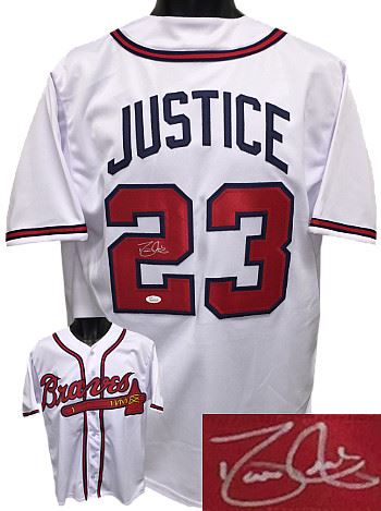 Justice made his major league debut in May 1989, playing for the last-place Braves. He earned the starting job after Braves fan favorite Dale Murphy was traded. Justice promptly went on an offensive tear during the second half of the 1990 season, finishing with 28 home runs, which helped him claim the National League's Rookie of the Year Award. In 1991, the upstart Braves surged to the top of their division and Justice was leading the National League in runs batted in when he was sidelined by a nagging back injury in June. He finished with 87 runs batted in despite the injury and played in his first World Series. Dave Justice Atlanta Braves has hand signed this White unlicensed custom-prostyle jersey with twill stitched nameplate and numbers. JSA Hologram and Certificate of Authenticity. Size XL