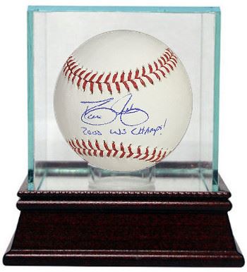 Justice made his major league debut in May 1989, playing for the last-place Braves. He earned the starting job after Braves fan favorite Dale Murphy was traded. Justice promptly went on an offensive tear during the second half of the 1990 season, finishing with 28 home runs, which helped him claim the National League's Rookie of the Year Award. In 1991, the upstart Braves surged to the top of their division and Justice was leading the National League in runs batted in when he was sidelined by a nagging back injury in June. He finished with 87 runs batted in despite the injury and played in his first World Series. Dave Justice has hand signed this Official Major League Baseball w/ 2000 WS Champs! inscription. MAB Hologram and Certificate of Authenticity from Athlon Sports Collectibles. Note: Glass Display Case shown IS included