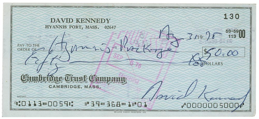 Son of Robert F. Kennedy who died of a drug overdose in 1984. Personal check, 6 x 2.5, filled out and signed by Kennedy, payable to Hyannis Package for $50.00, August 31, 1978. A vertical fold and bank stamp to body, lightly affecting beginning of signature, otherwise fine condition.
