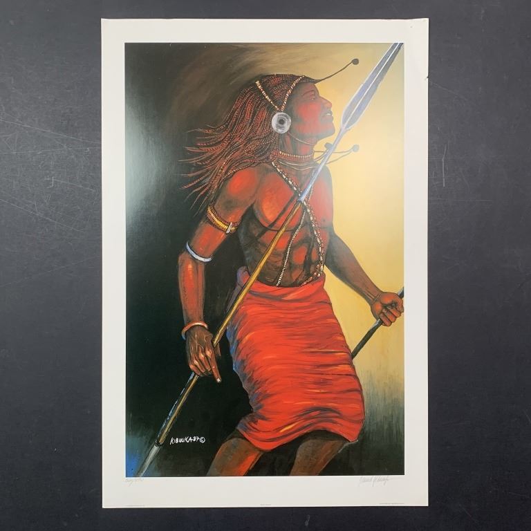 David Kibuuka's "Ritual Dance II" Limited Edition Print. The warrior dances with his spear in fluid motions. He is as practiced in this artform as his hunting skills. This piece is signed in the lower right and numbered 521/590 in the lower left. There is a small tear in the right margin but otherwise in excellent condition.