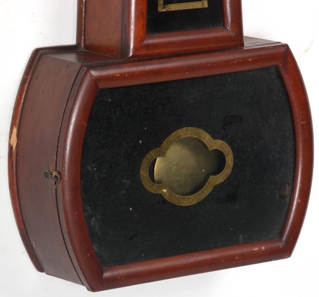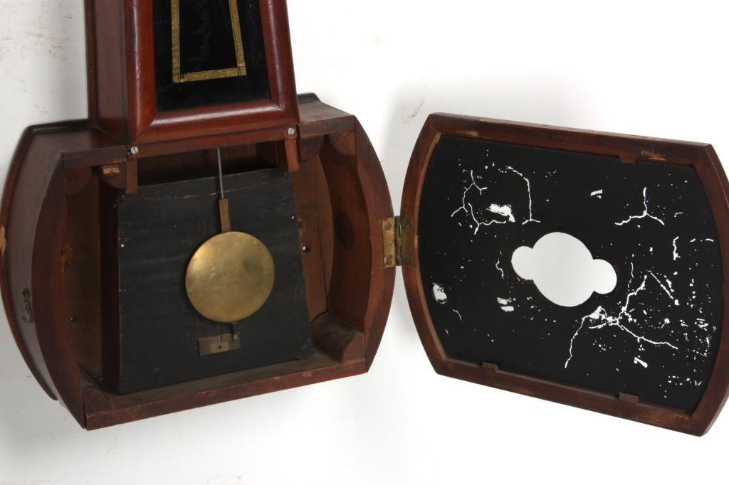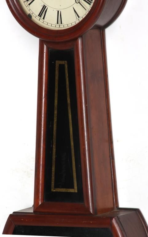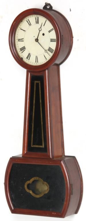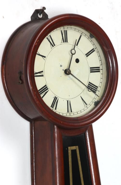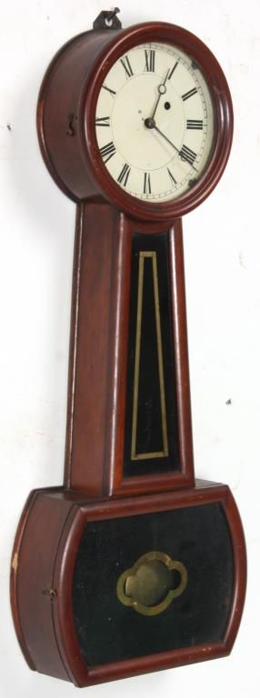 David L. Williams Weight Driven Banjo Clock. David L. Williams, Massachusetts Weight Driven Banjo Clock. 7 in. painted metal dial has black Roman hour numerals with some flaking and inpainting and blued open moon hands; typical 8 day brass weight driven time only banjo clock movement with recoil escapement, iron weight, brass pulley, long steel pendulum stick with brass bob and partial lockdown hardware. In a mahogany, banjo style case with round door bezel with original glass, reverse painted throat glass and reverse painted lower door glass are both original and in good overall condition; case is stamped “D.L.W.”, case has an overcoated finish. 29 in. high x 11 in. wide x 4 in. deep.