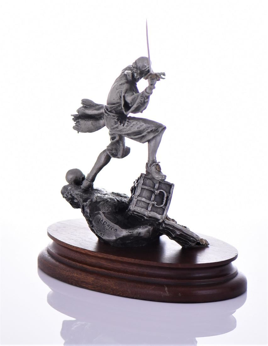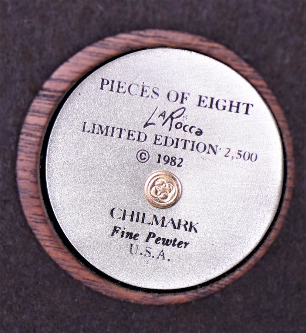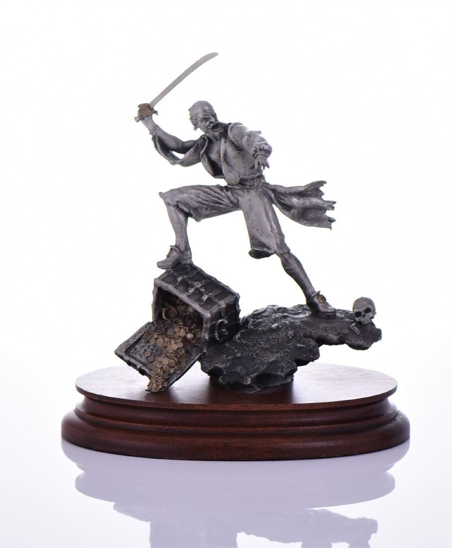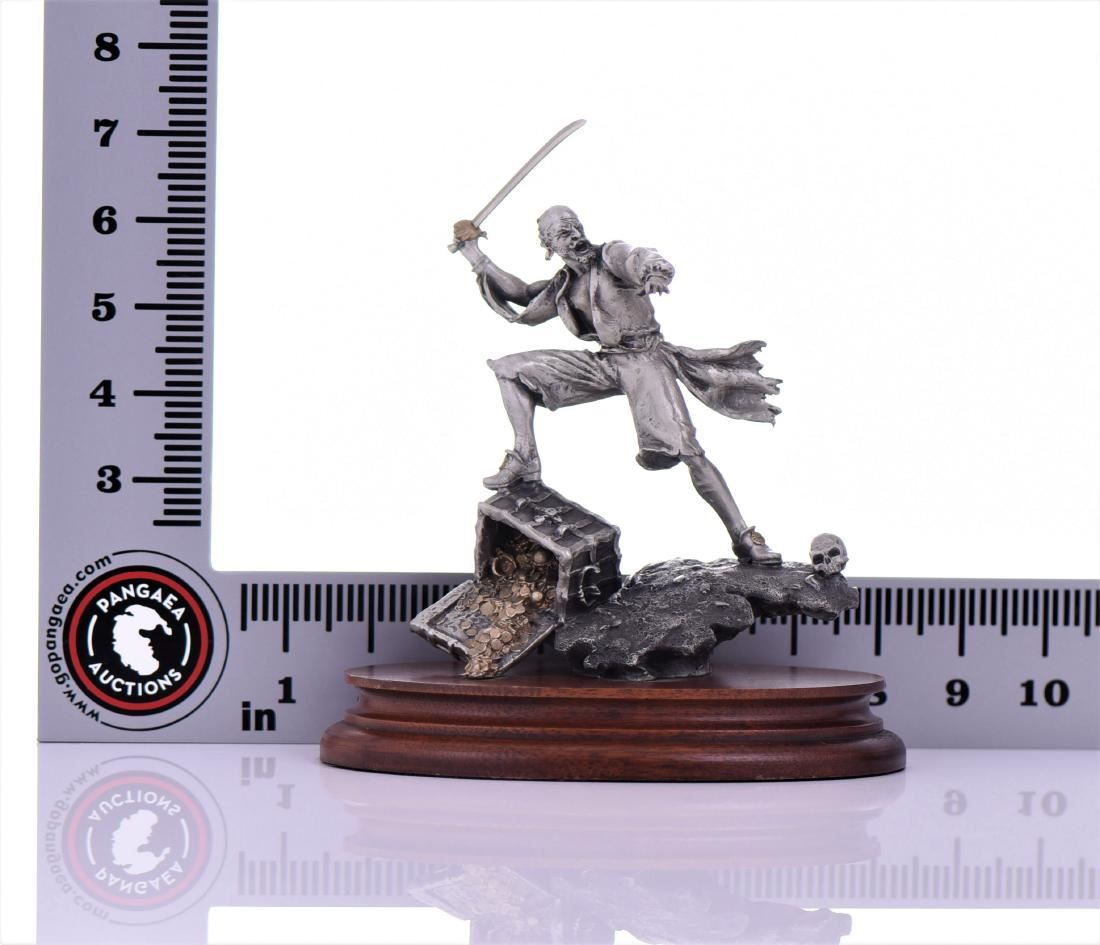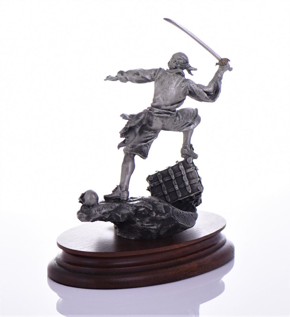 David LaRocca, 1982 Titled "Pieces Of Eight" Limited Edition 390 of 2500. Chilmark's Fine Pewter On Wood Base Pirate Art Sculpture. Estimated less than 50 yrs old. Pewter is a malleable metal alloy, traditionally 85 to 99 percent tin, with the remainder consisting of copper, antimony, bismuth and sometimes, less commonly today, lead. Silver is also sometimes used. Copper and antimony act as hardeners while lead is common in the lower grades of pewter, which have a bluish tint. It has a low melting point, around 338 to 446 deg F, depending on the exact mixture of metals. (Wikepedia) Size and/or Weight: See Measurement Photo. (Photos Represent The Lot Condition.)